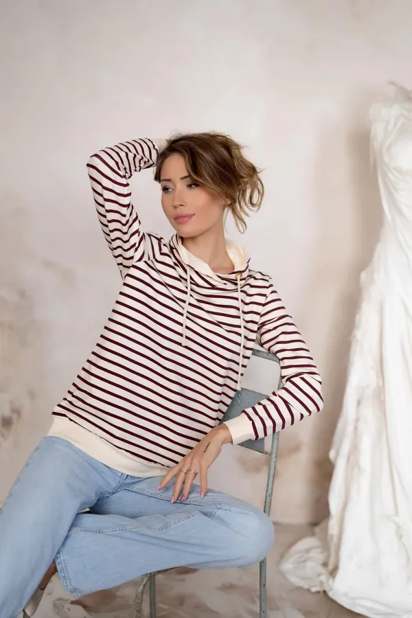 Худи женский их хлопкового трикотажного полотна трехнитки прямого силуэта с воротником типа хомут. Рукава длинные, втачные с манжетой. Низ худи также обработан притачной деталью, как у манжета рукавов. Воротник притачной асимметричный с завязками. Ткань приятная для прогулок, занятия спортом. Худи сочетается с брюками, джинсами, юбками.