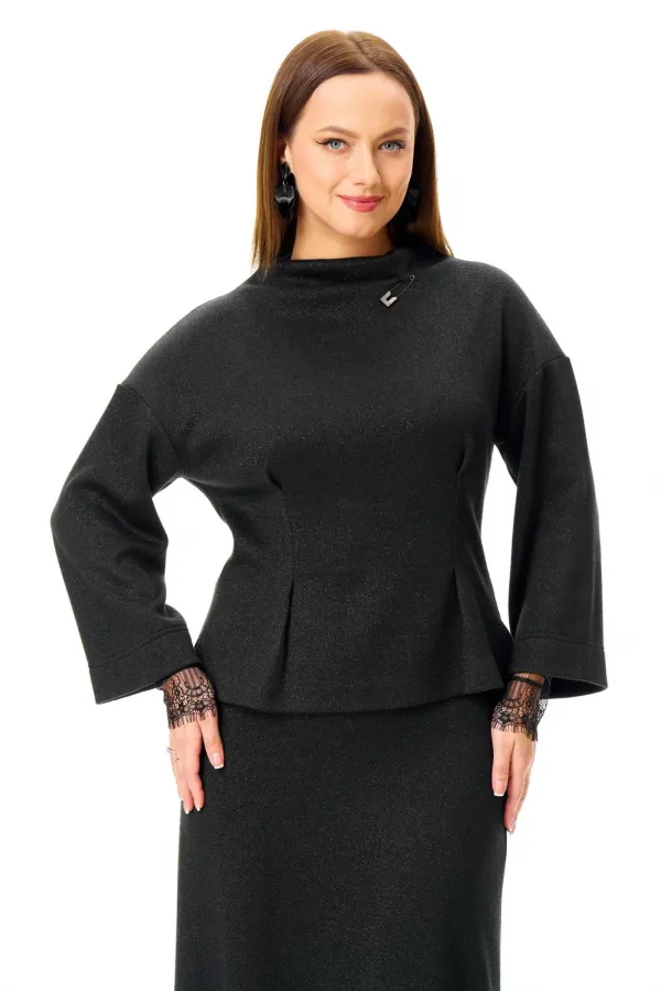 Джемпер свободного силуэта из однотонного трикотажного полотна с неярким блеском «люрекс». Горловина цельная «стойка». Плечо спущено. Рукав 3/4. По переду притален складками. Съемные кружевные манжеты добавляют страсти образу. Стильная булавка убережет от сглаза.