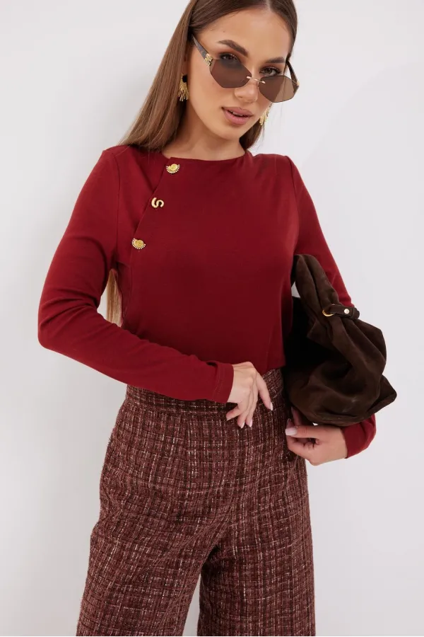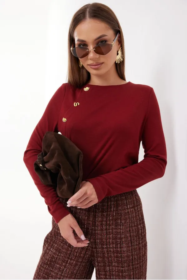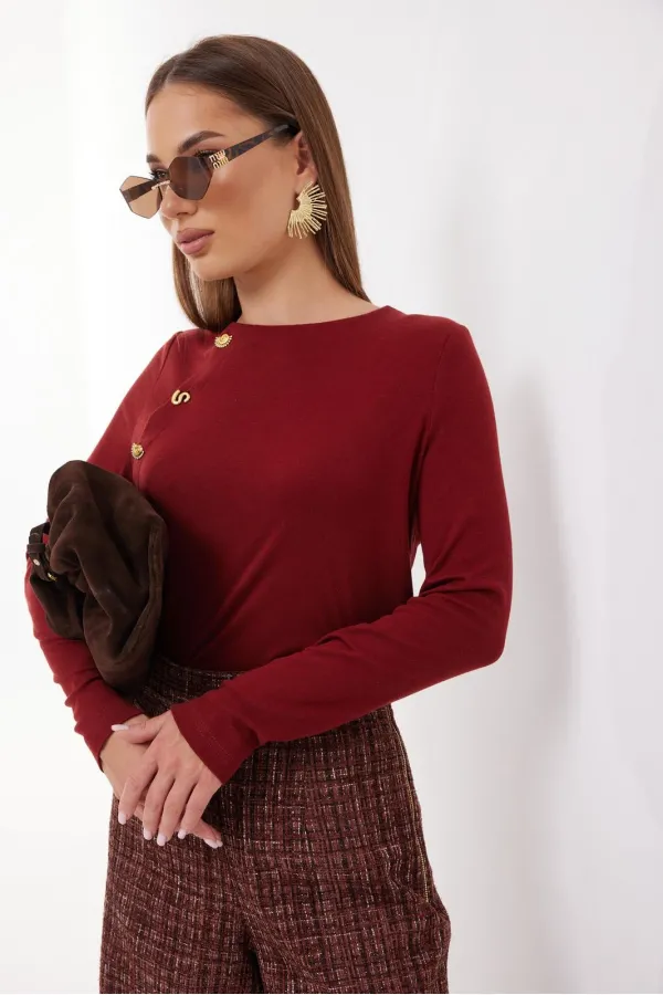 Джемпер женский прилегающего силуэта из мягкого трикотажа, с декоративной планкой по переду с имитацией застежки на 3 петли и пуговицы. Рукав втачной