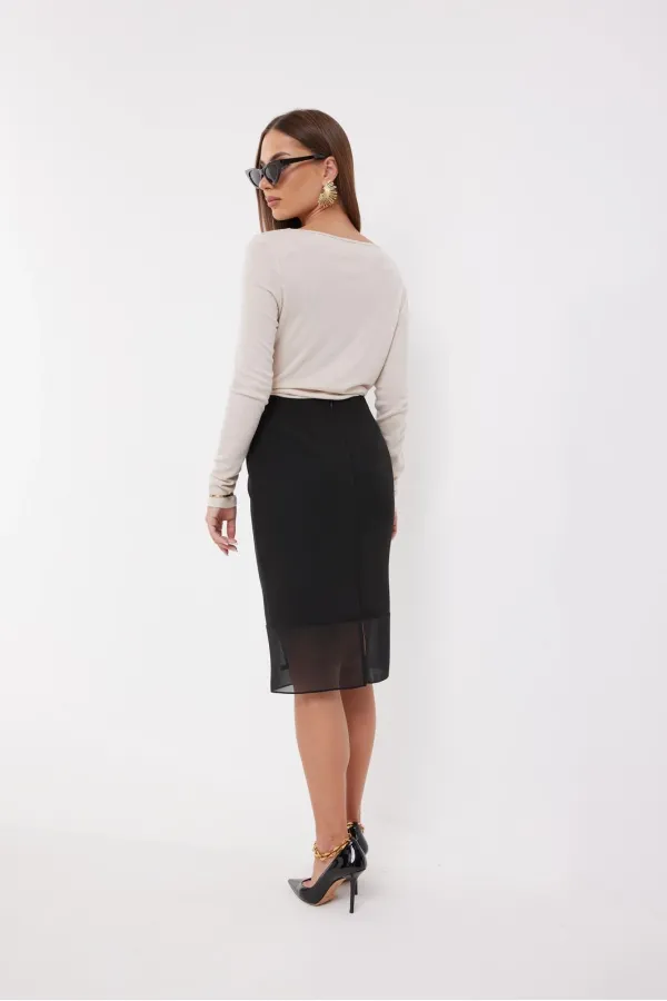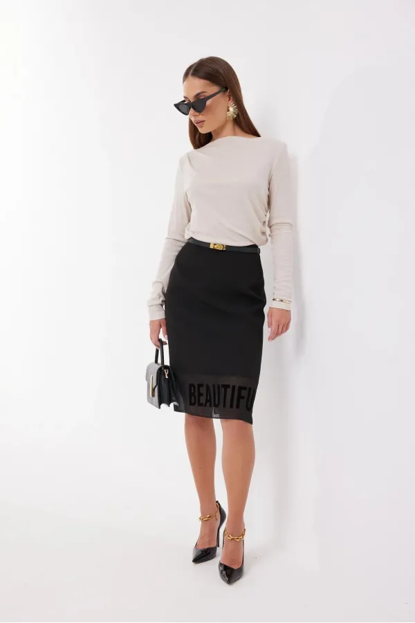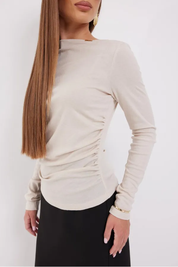Джемпер женский прилегающего силуэта из мягкого трикотажа, с небольшой драпировкой в области талии слева, горловина «лодочка», в правом плечевом шве две мягкие складки. Рукав втачной одношовный узкий, удлиненный для эффекта небольшой сборки в нижней части.