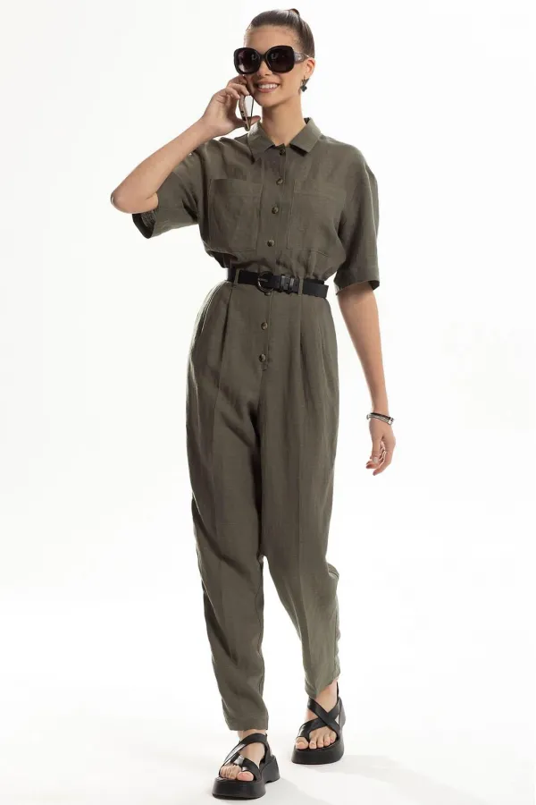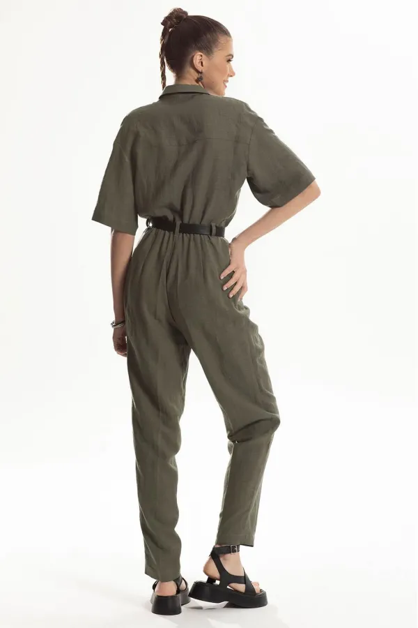 Комбинезон с центральной застежкой на петли и пуговицы, втачным воротником с отрезной стойкой. По переду- накладные карманы, расположенные на уровне груди. Спинка со средним швом. Комбинезон со съемным поясом. Нижняя часть комбинезона с карманами, и двумя односторонними складками, вход в карман наклонный к боковому шву.