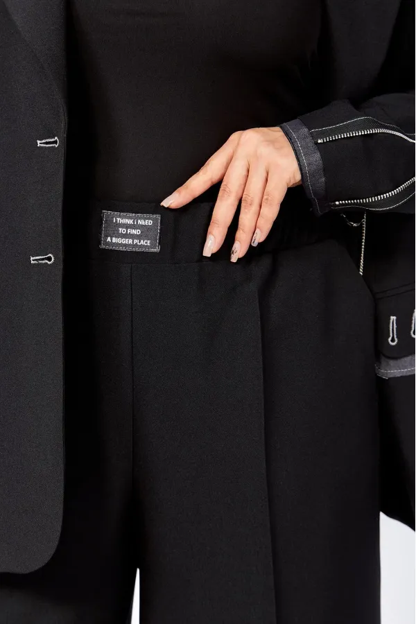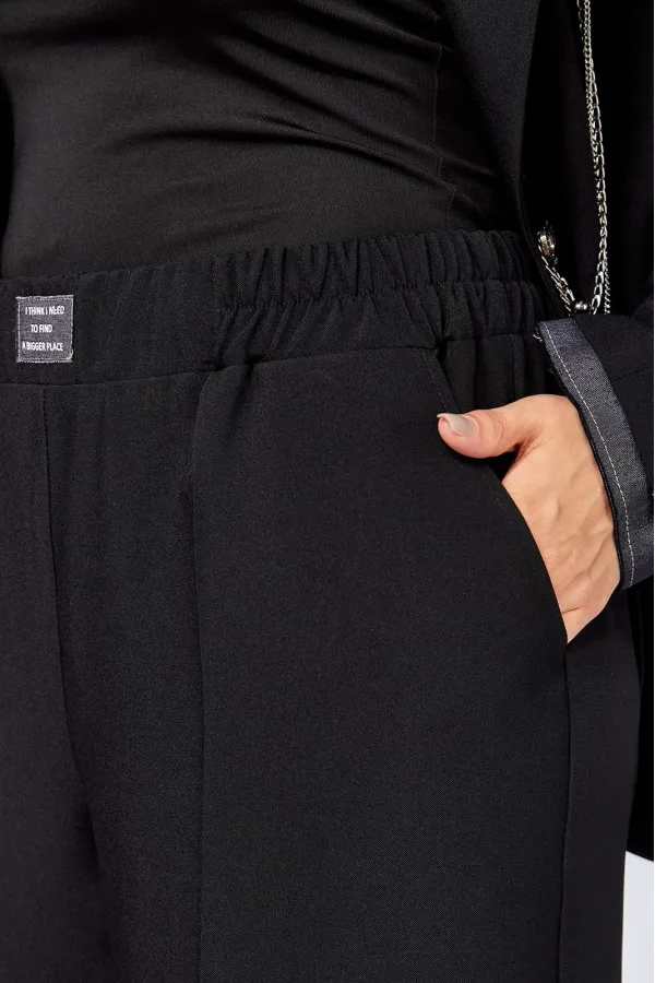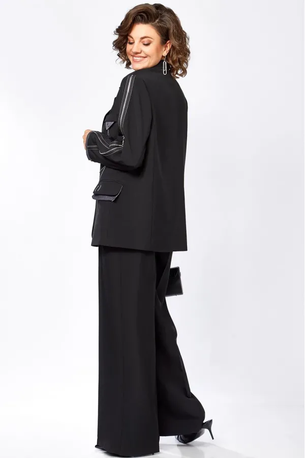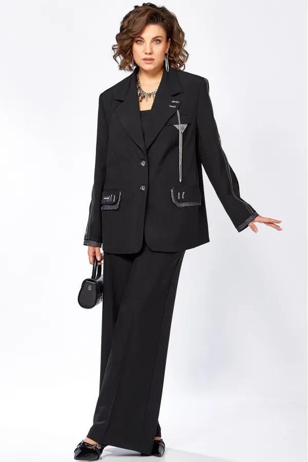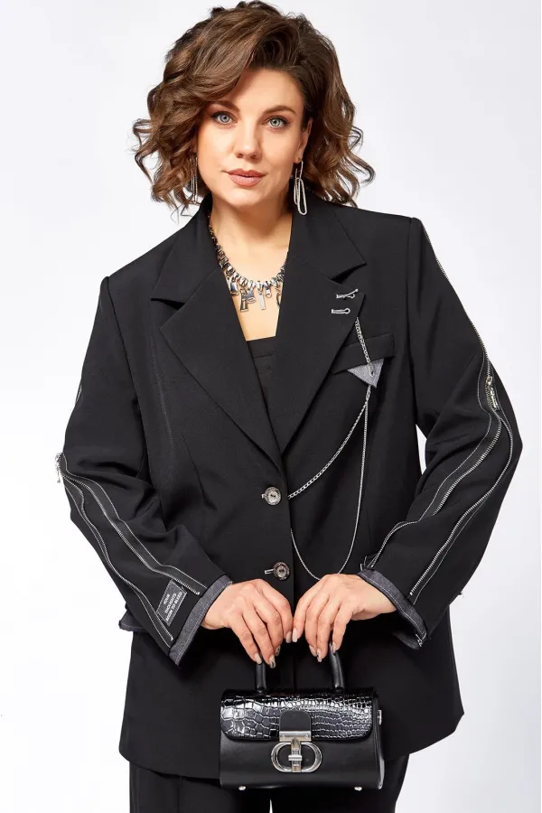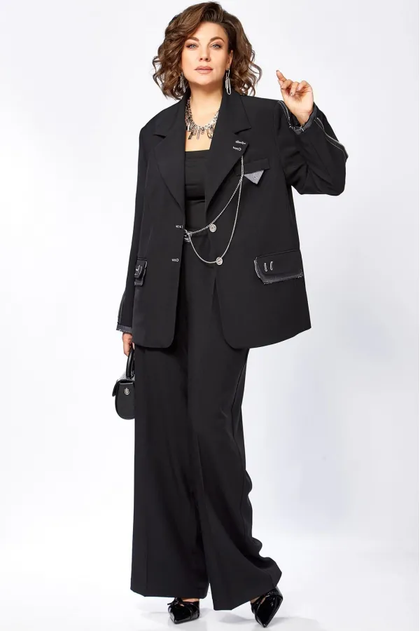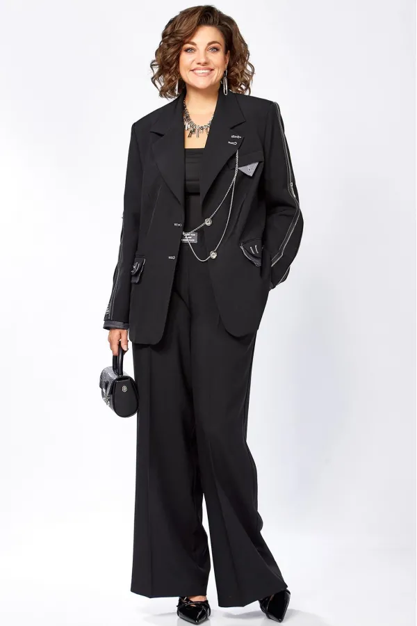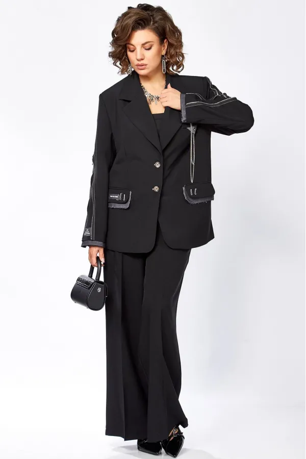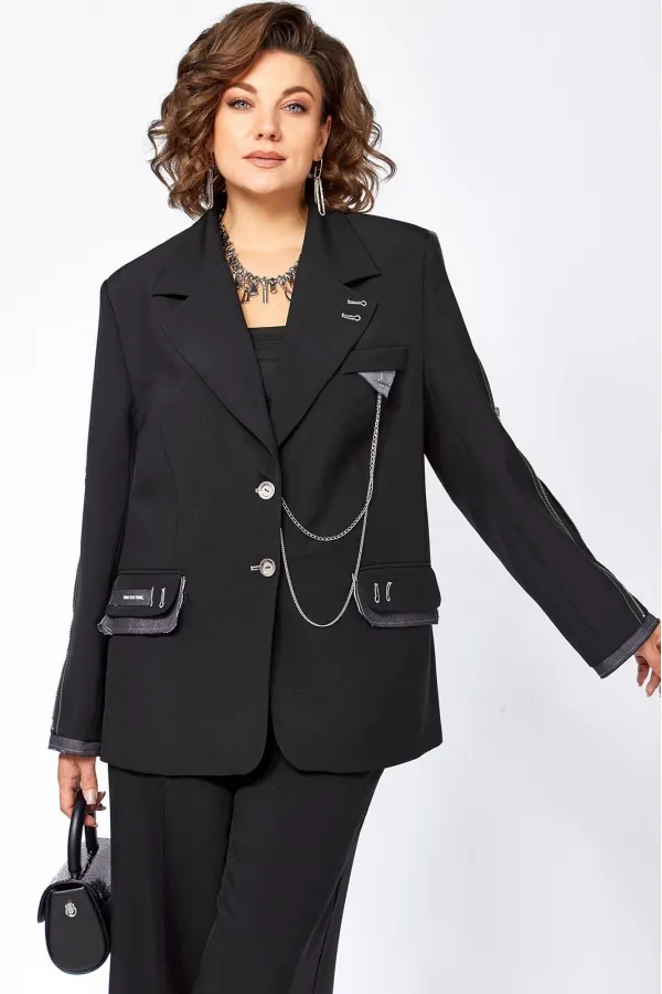 Брючный костюм в современном, слегка дерзком стиле. Удлиненный однобортный Жакет свободного классического кроя на подкладке ,с подвесными декоративными элементами-металическими цепочками , молниями на рукавах ,карманами с двойным клапоном , нагрудной листочкой , а отделка из множество контрастных глазковых петель ,креативное решение для мульти использования сьемного декора. Жакет придает образу строгий, но в то же время модный характер. Брюки свободного силуэта ,средней посадки, с боковыми карманами ,на эластичном поясе, что обеспечивает максимальную комфортной носки в течении всего дня . В целом костюм сочетает в себе элементы уличного и делового стиля без использования строгого дресс-кода, наш костюм -идеальная база для создания образа стильной, уверенной и немного роковой женщины .