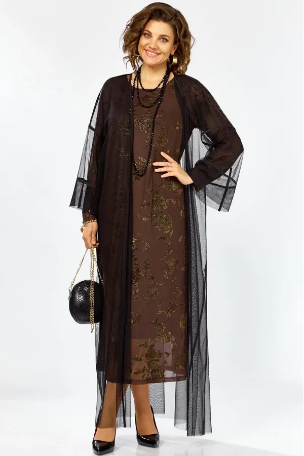 Роскошный плательный комплект. Платье на трикотажной подкладке полуприлегающего силуэта из мягкой стретч-сетки украшенной флоковым напылением с позолотой создает эффект дорогого кружевного орнамента. Образ дополняет Сверху легкая накидка кардиган-шазюбль из прозрачной сетки , она мягко драпируется , создавая воздушный легкий силуэт длинные рукава и свободный крой добавляют образу благородства и загадочности этот комплект идеально подойдёт для вечерних мероприятий торжеств и особых случаев.