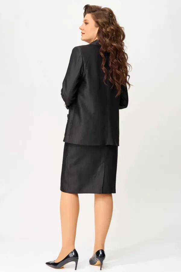 Полуприлегающий силуэт жакета на подкладке мягко очерчивает фигуру, будто повторяя её движения. Ткань Лумина с вискозой в составе играет на свету благородным блеском, придавая образу особую глубину. Однобортная застёжка на петли и пуговицы — классика, которая не теряет актуальности. Воротник и лацканы пиджачного типа добавляют строгости, а рельефы и накладные карманы с декоративной цепочкой — нотку изящного шика. Карман-обманка на левой полочке — как лёгкий флирт с традицией, а две декоративные пуговицы на рукавах — как драгоценные акценты, завершённые с ювелирной точностью. Средний шов по спинке — линия, соединяющая форму и содержание.
