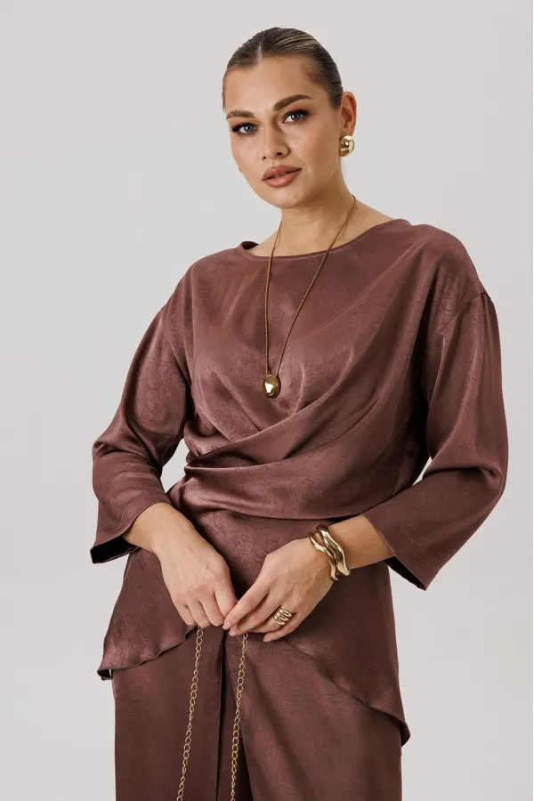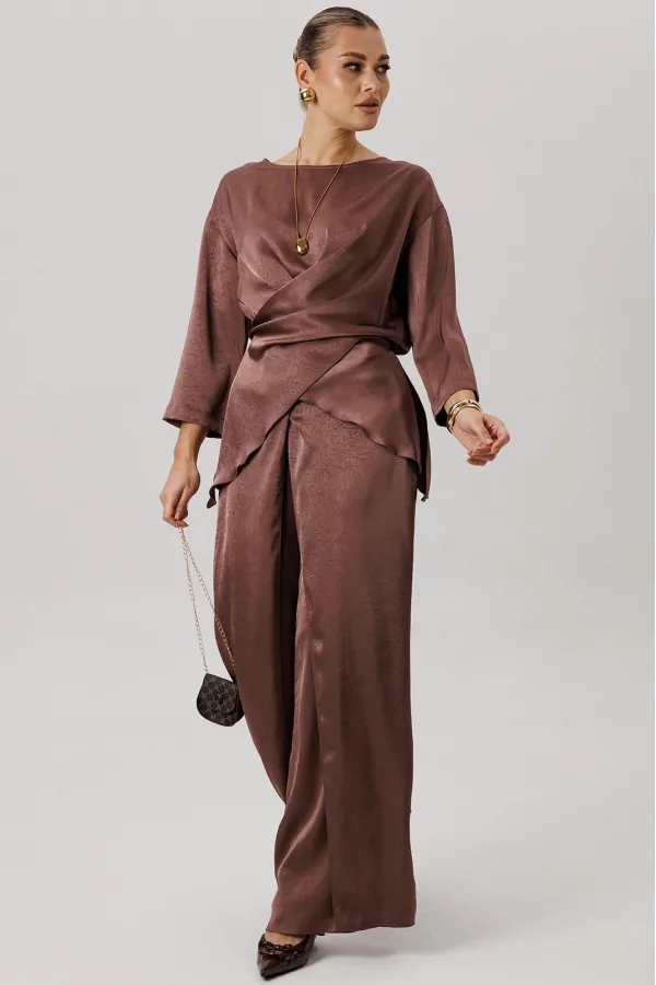 Невероятная блуза из одноимённой ткани завершает образ, превращая его в платье или даже комбинезон.