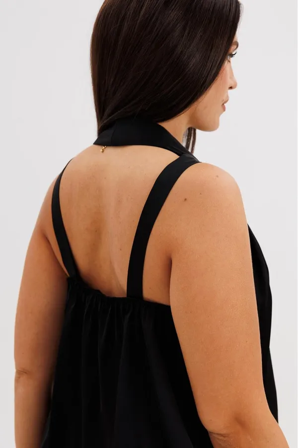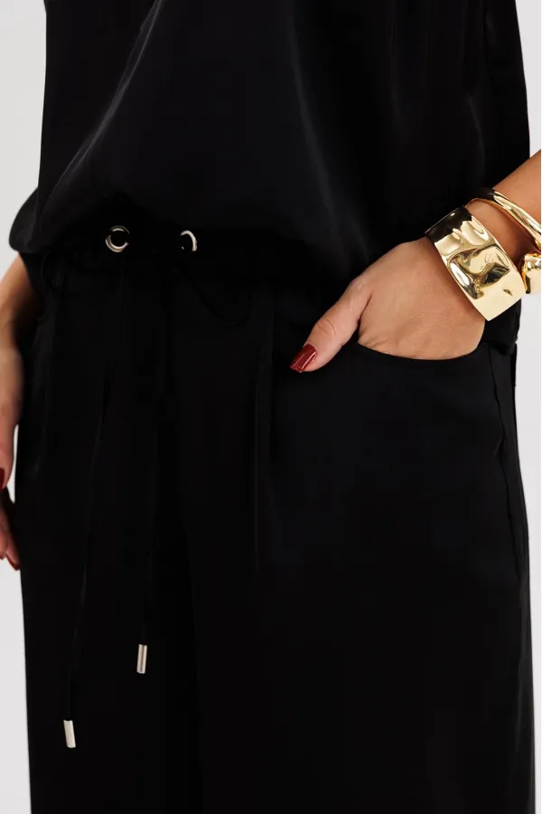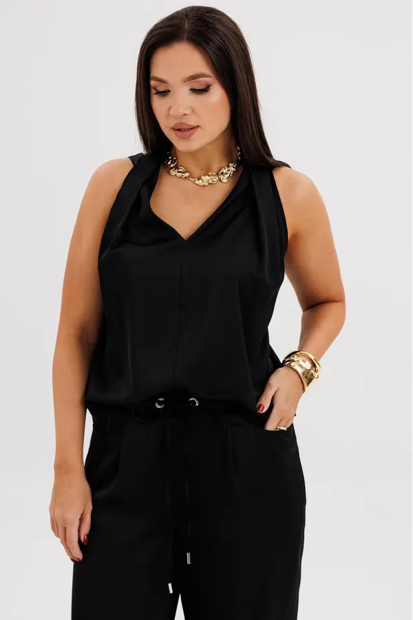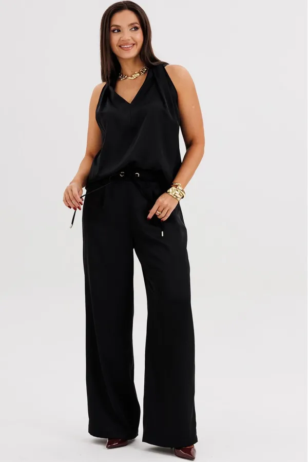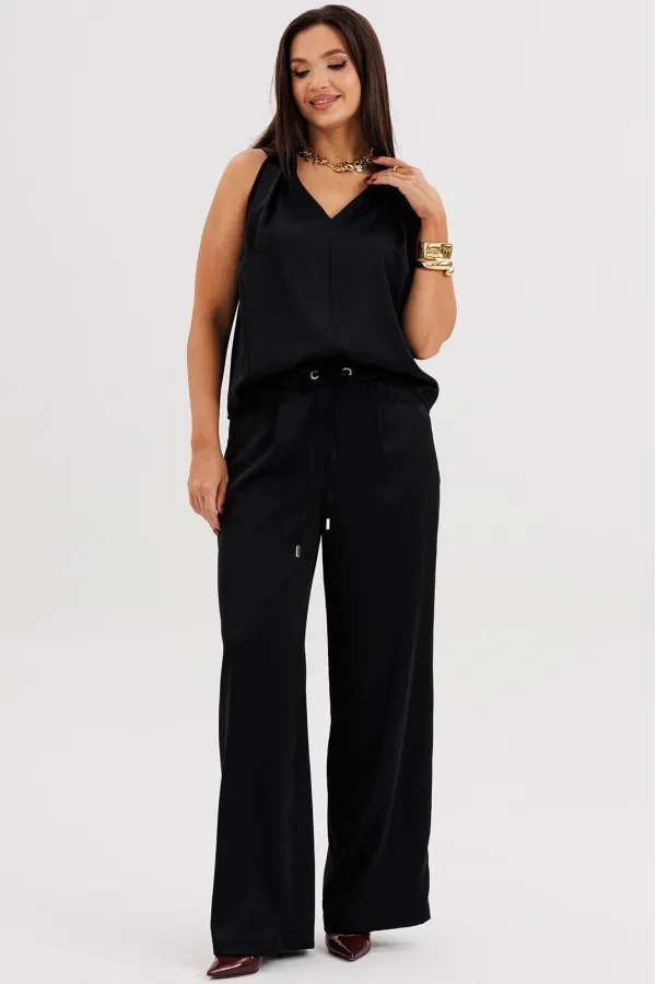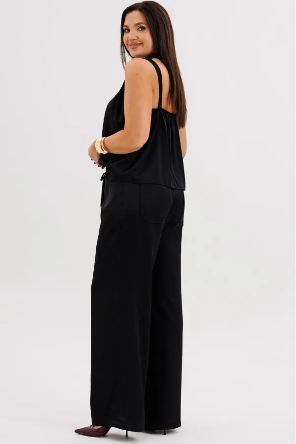 Эффектный топ с V-образным вырезом и воротником-холтер мягко драпируется от линии плеч, создавая женственный силуэт и лёгкий акцент на зону декольте. Брюки свободного покроя на эластичном поясе со шнуром-завязкой и металлическими люверсами придают образу расслабленную изысканность и ощущение непринуждённого шика.