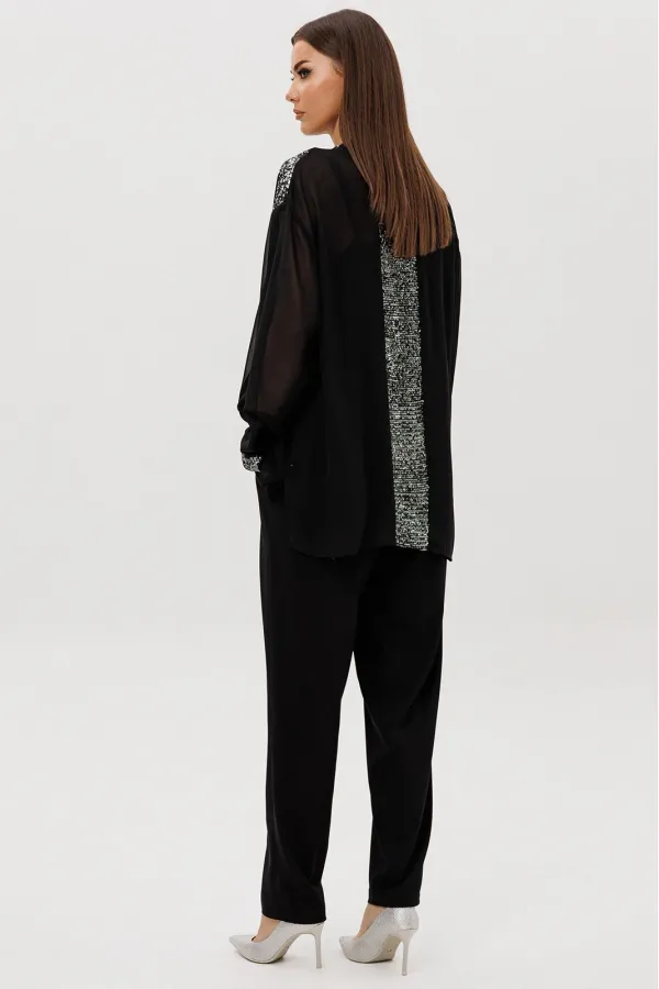 Эффектный брючный комплект-тройка — воплощение современного стиля с ноткой вечерней элегантности.Лёгкая шифоновая блуза свободного покроя украшена изысканной отделкой пайетками по линии борта и манжетам, создавая тонкий ... Читать далее...