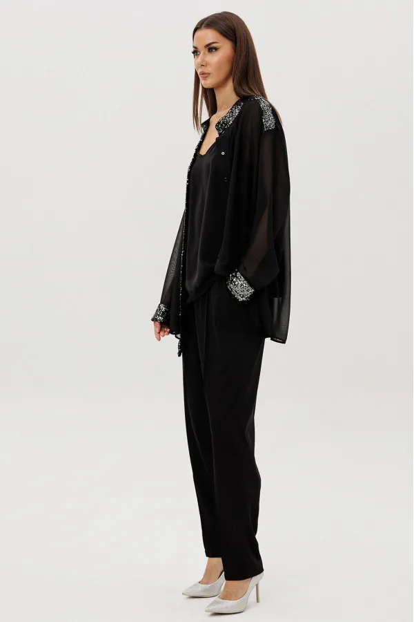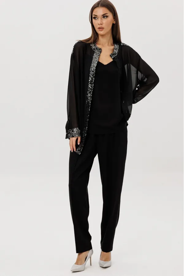Лёгкая шифоновая блуза свободного покроя украшена изысканной отделкой пайетками по линии борта и манжетам, создавая тонкий блеск и игру света в движении. Атласный топ на регулируемых бретелях добавляет мягкого женственного сияния и комфортно садится по фигуре. Брюки из поливискозного полотна со стрелками и эластичным поясом завершают образ, сочетая удобство и безупречный силуэт.