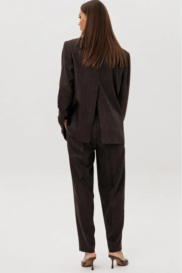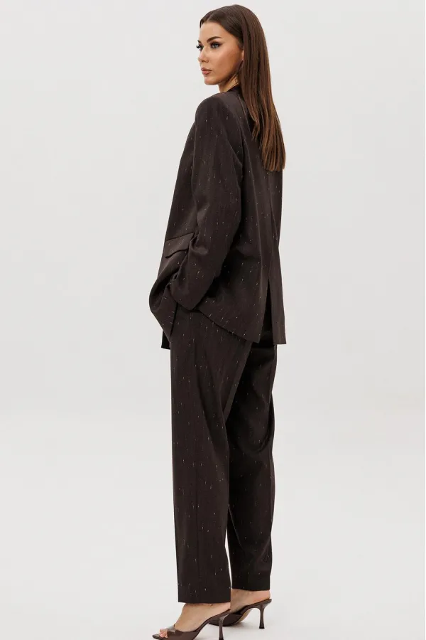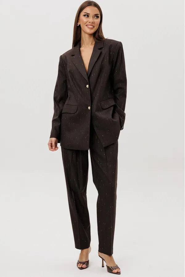 Комплект из невероятного, мерцающего полотна Жакет свободного расширенного силуэта, втачного покроя с центральной застёжкой и классическим английским воротником. Полочка с отрезным бочком, нагрудной вытачкой и прорезным ... Читать далее...