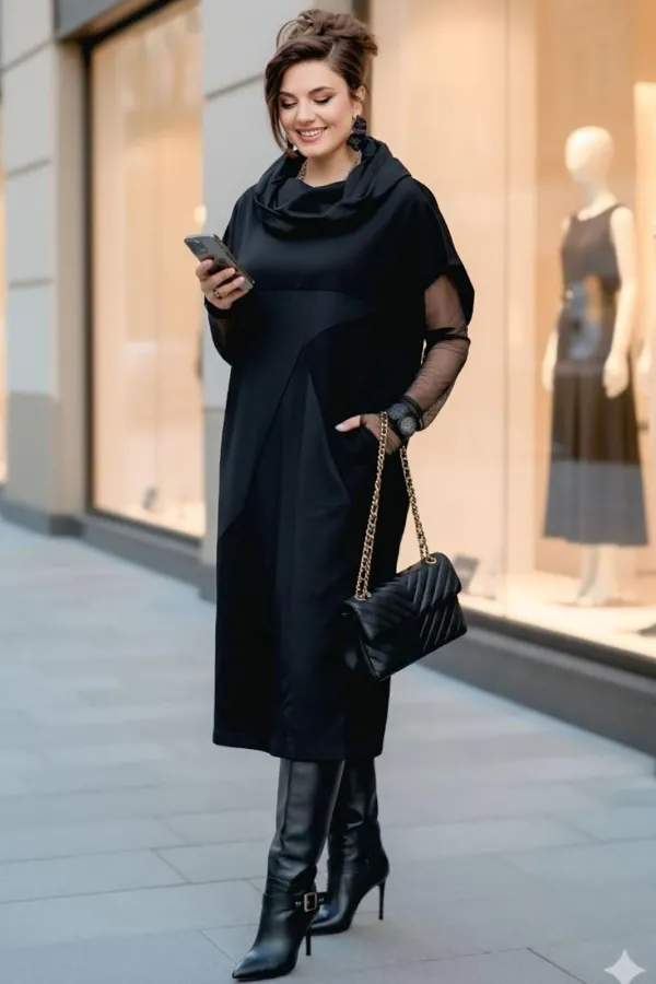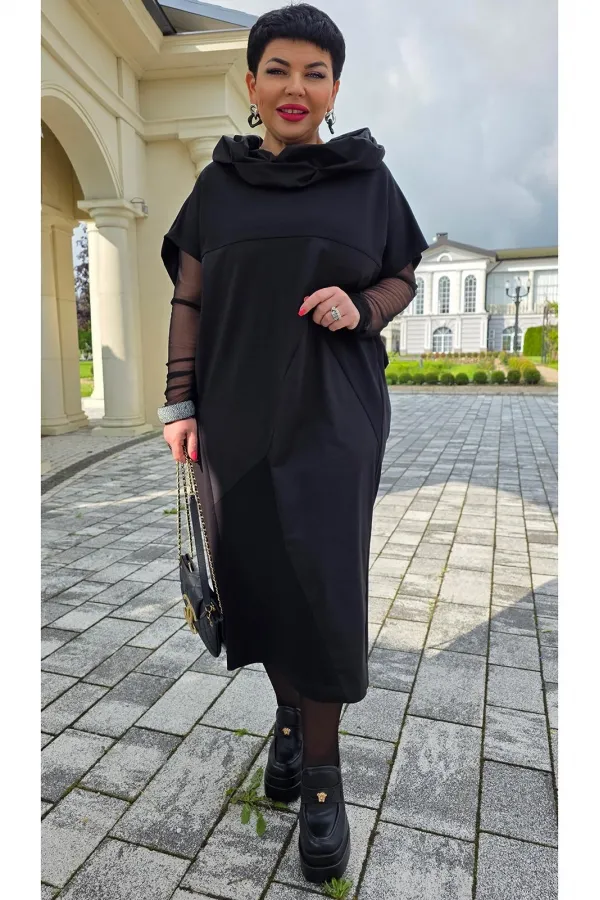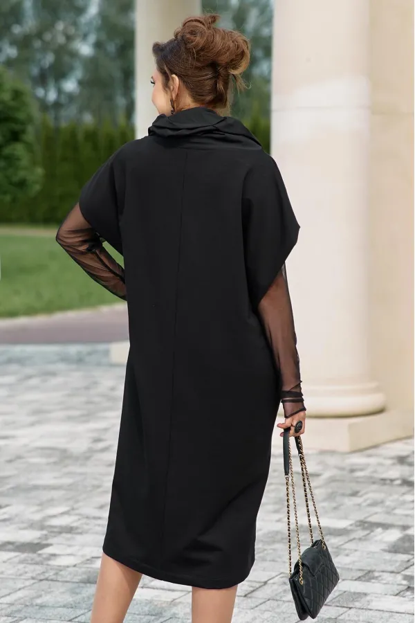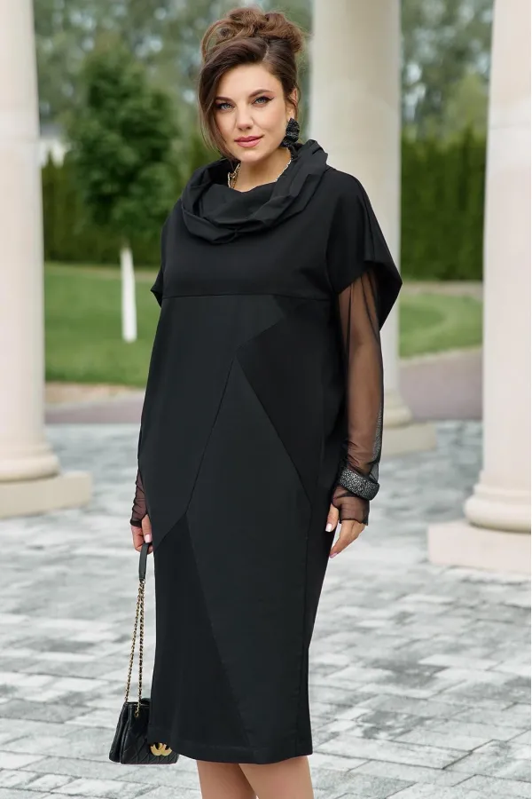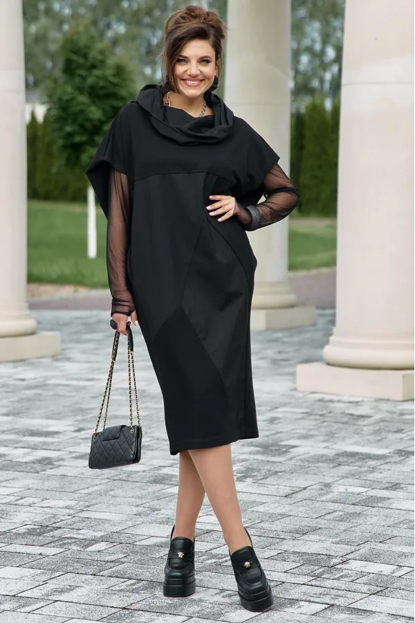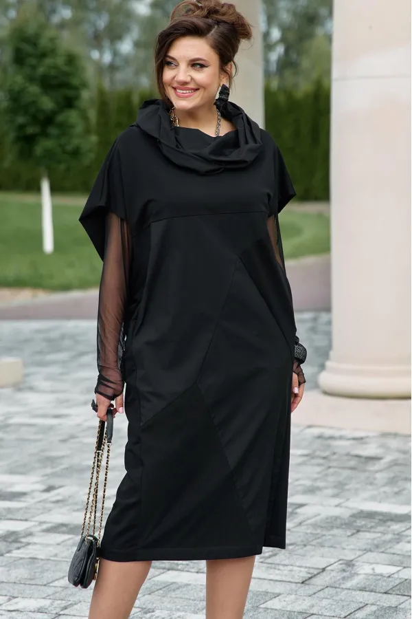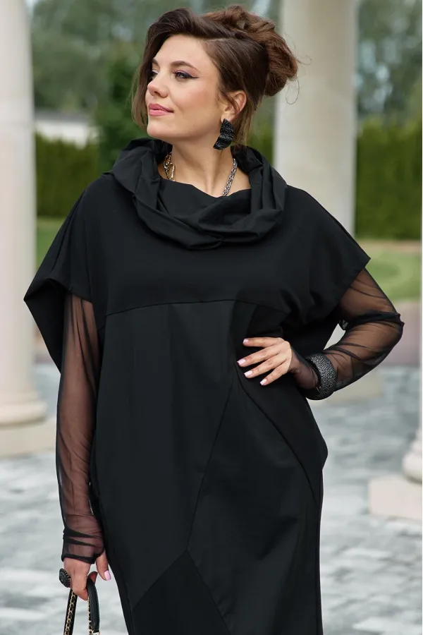 Комплект женский состоящий из платья и блузона. Платье свободного силуэта заужается к низу. Горловина округлой формы, с притачным воротником по форме «хамут» с декоративными защипа, создающими оригинальную форму, из отделочной ткани. По переду платья отрезная кокетка, геометрические подрезы с вставками из отделочной ткани. Сочетание разных фактур ткани чёрного цвета создаёт стильный образ на каждый день. Спинка в платье со средним швом. В боковых швах платья карманы.