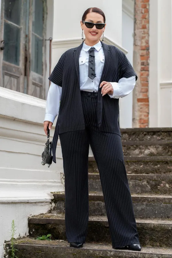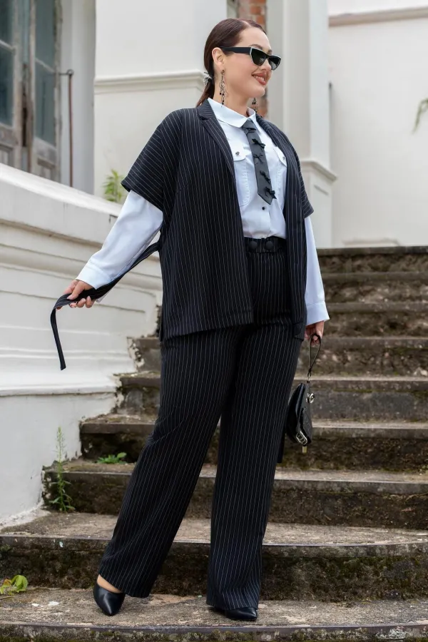 Костюм жилет и брюки из класической костюмной полоски. Безусловная класика совремееная и всегда привлекает взгляды.Жилет прямого кроя со съёмным поясом,воротник пиджачного типа. Жилет с центральной бортовой застёжкой на три петли и три пуговицы. По боковым швам обработаны разрезы и шлёвки под пояс.Брюки женские прямого силуэта, из класической костюмной полоски, по переду пояс со шлёвками, и застёжка на тесьму-молниюи пуговицы, по спинке пояс с эластичной резинкой. Брюки с боковыми наклонными карманами. Брюки со стрелками.