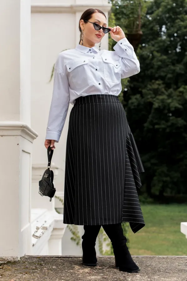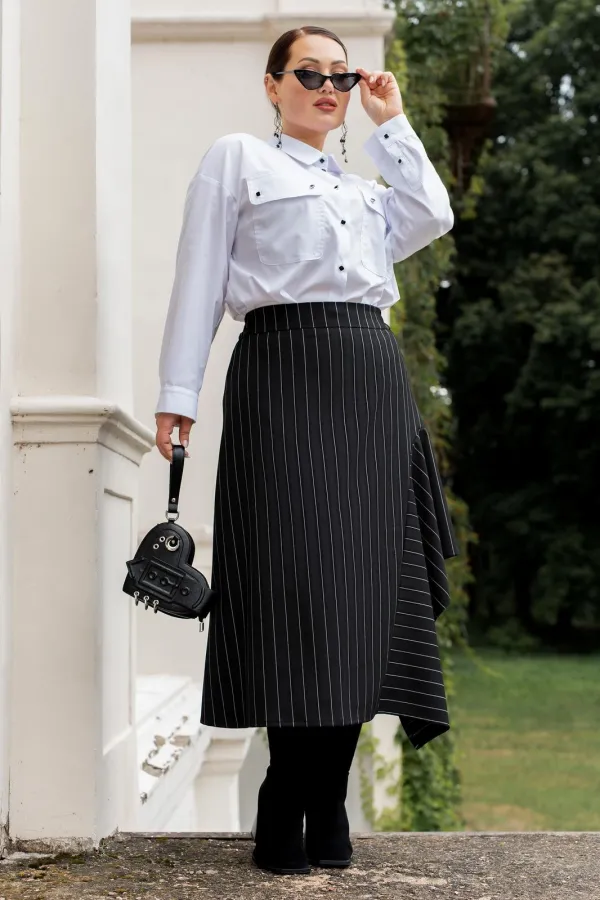 Комплект юбка, рубашка и галстук. Рубашка женская выполнена из хлопоковый ткани, с отложным воротником на стойке, с центральной застёжкой на петли и пуговицы. полочки с нагрудными вытачками с накладными карманами к клапанами, застёгивающиеся на петли и пуговицы, рукава рубашечного кроя, с притачными манжетами, застёгивающиеся на петли и пуговицы. спинка цельная, по бокам обработаны разрезы. Юбка женская асиметричного кроя, из классической костюмной полоски, по переду пояс вставка, по спинке пояс с эластичной резинкой.