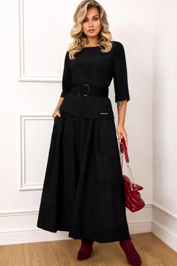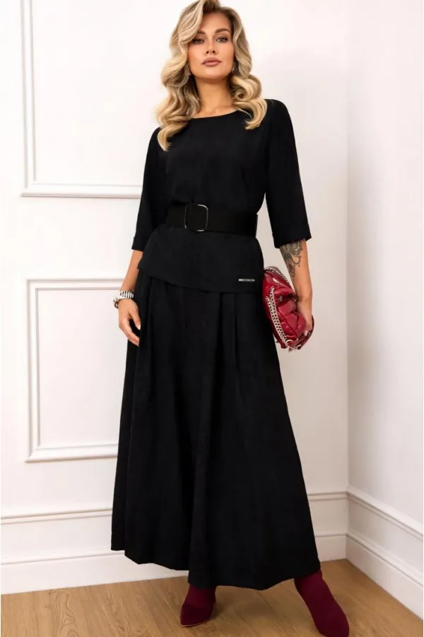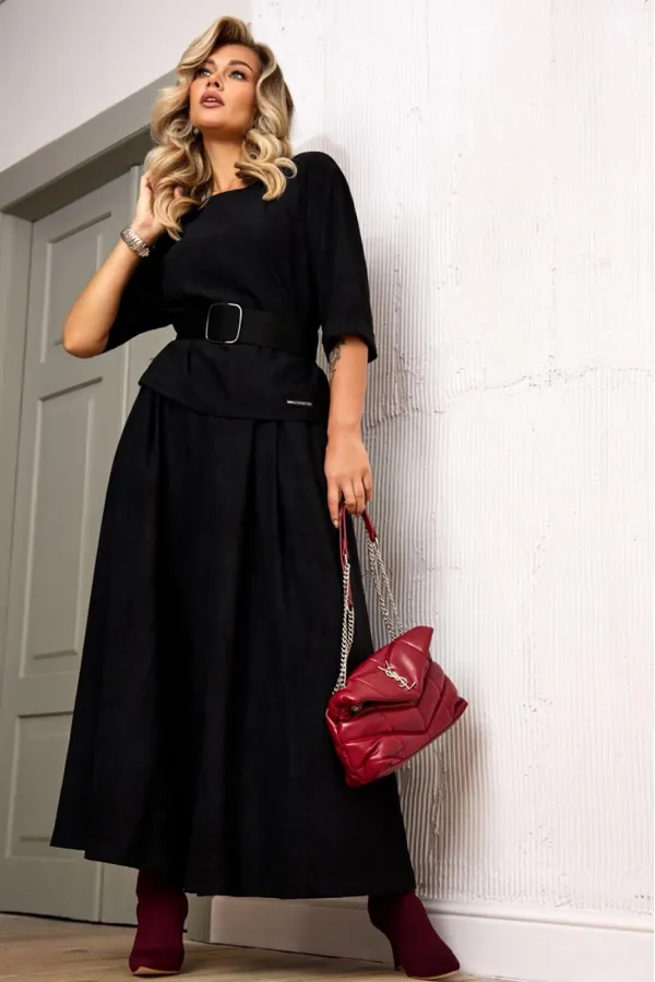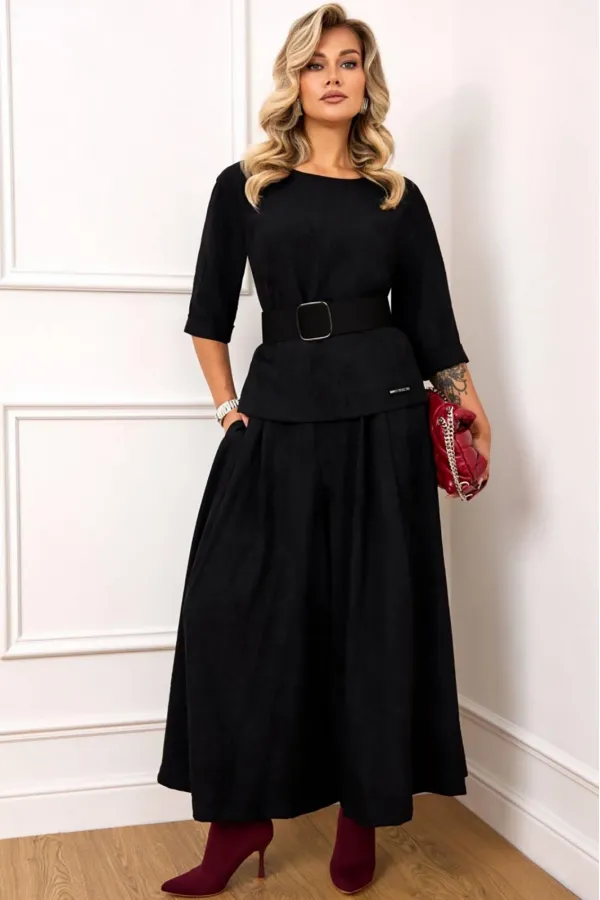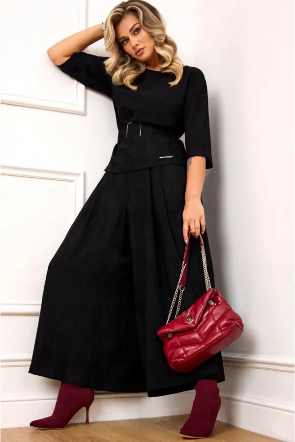 Стильный женский комплект, состоит из блузы и брюк-юбки. Блуза прямого силуэта с эффектом жатки, что придаёт изделию особый стиль. Блуза с нагрудными выточками, рукав длиной ¾, с манжетой, по бокам с небольшими разрезами (разрез 9 см). Перед блузки декорирован пришивной дизайнерской нашивкой. Брюки-юбка прямые, со складками по переду и спинке с эффектом жатки. Брюки-юбка на поясе, по бокам с резинкой, по спинке с застежкой на потайную молнию и пуговицу. В комплекте идет съемный кожаный пояс.