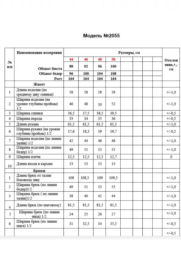 | Ткань | Жакет плательно-костюмного ассортимента «Фиона» 95%П/Э 5%спандекс. Брюки плательно-костюмного ассортимента «Зара» 95%П/Э 5%эластан |