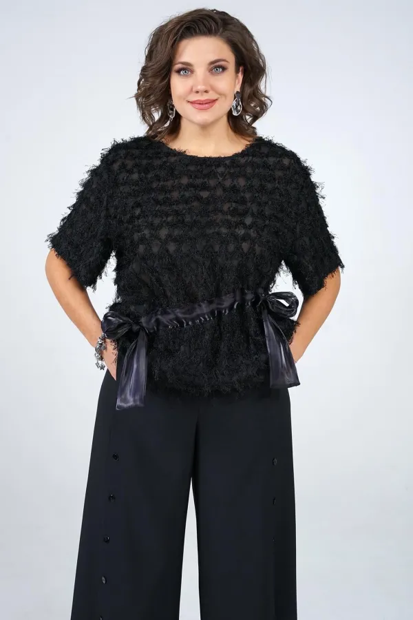 Блуза прямого, свободного силуэта, со спущенной линией плеча, с втачными одношовными, короткими рукавами. По переду степень прилегания фиксирует отделочная кулиса с завязкой.