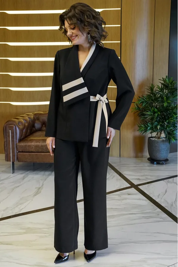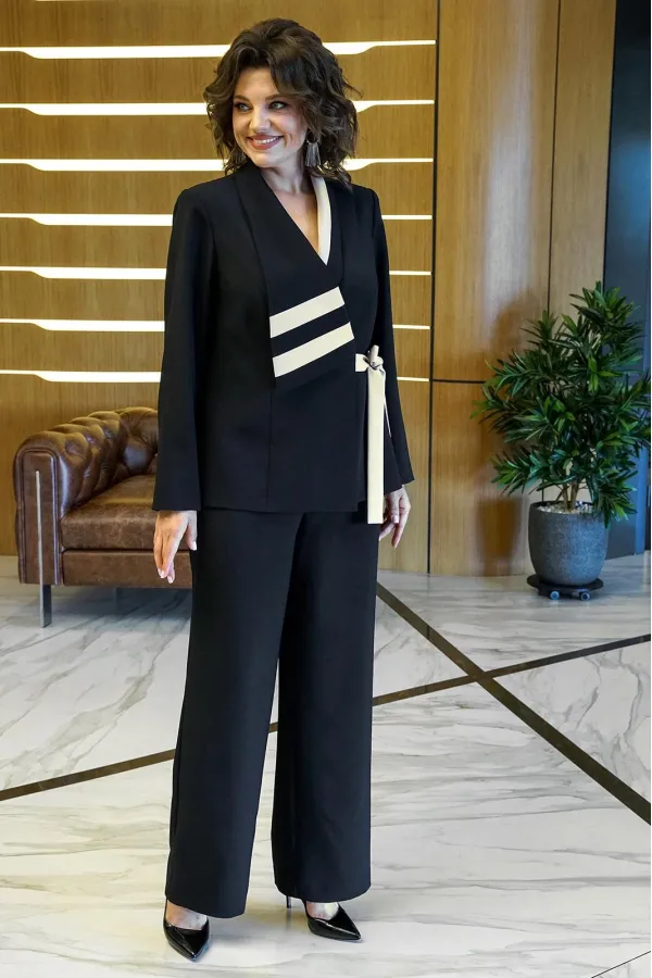 Комплект (жакет+брюки)Жакет полуприлегающего силуэта, частично на подкладке (перед), с двух-бортной застёжкой с завязывающимся поясом (выполнении из отделочной ткани) и с внутренней застёжкой на петлю и пуговицу. Перед с... Читать далее...