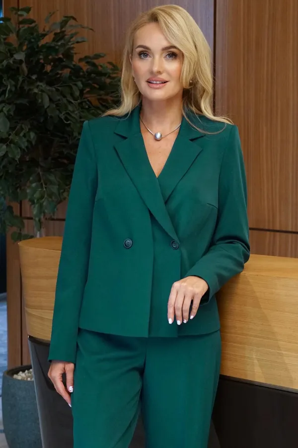 Жакет прямого силуэта, с двухбортной застёжкой на петлю, пуговицу и имитацией центральной застёжки и внутренняя застёжка на петлю, пуговицу. Перед с нагрудными выточками. Спинка со средним швом. Рукава втачные, двухшовные, длинные. Воротник пиджачного типа с отложными лацканами.