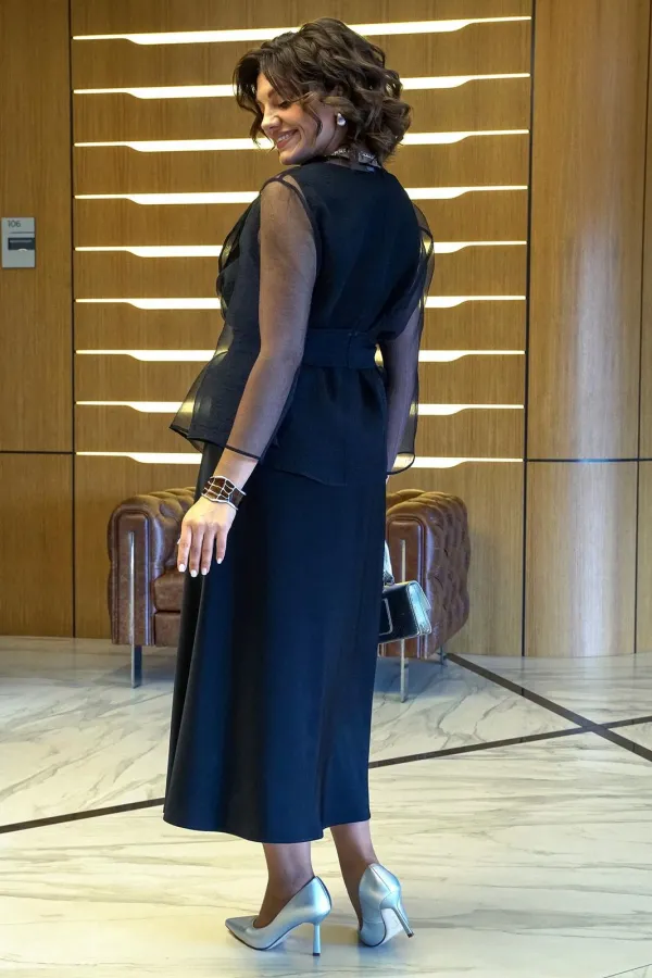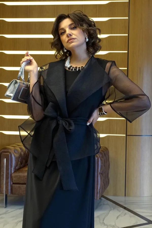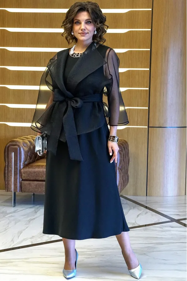 Комплект женский 2-х предметный состоит из блузона и платья.Блузон прямого, свободного силуэта, без застёжки на запах, с завязывающимся поясом. Перед с отложными лацканами. Спинка со средним швом. Рукава втачные, одношов... Читать далее...