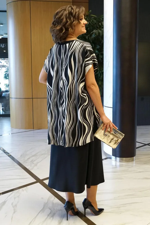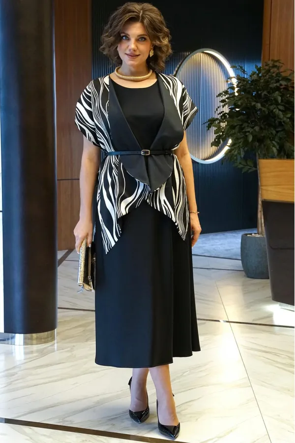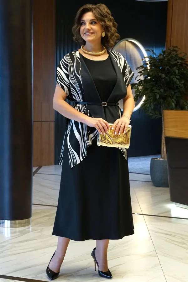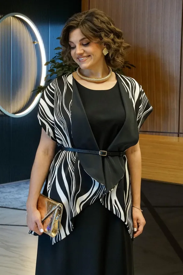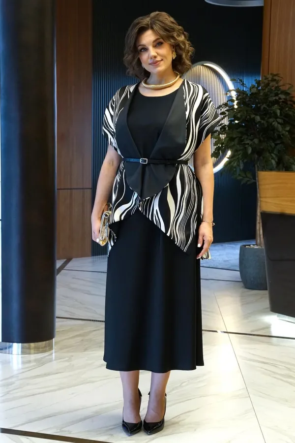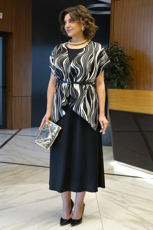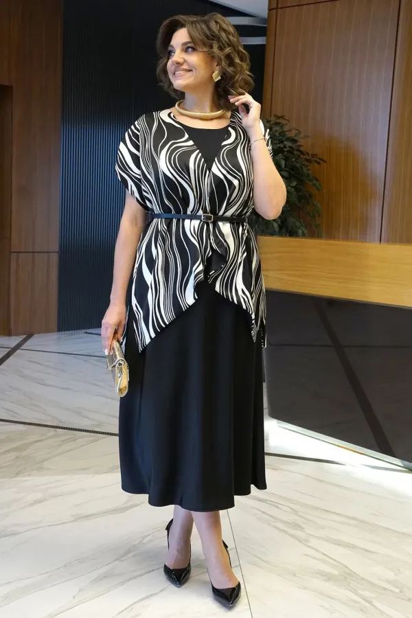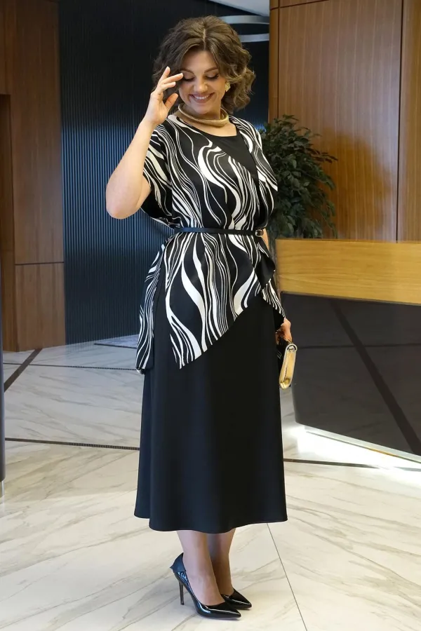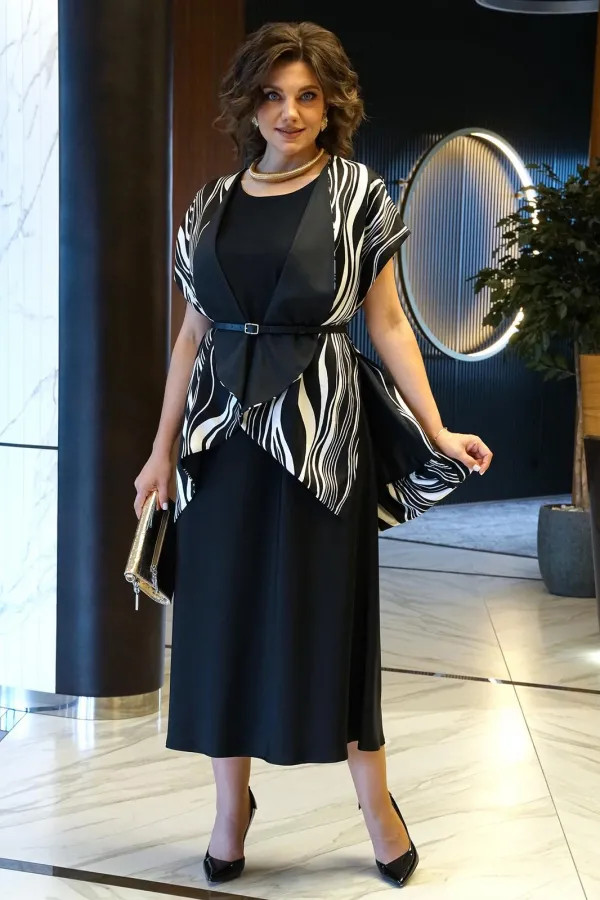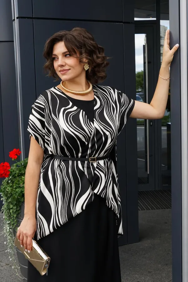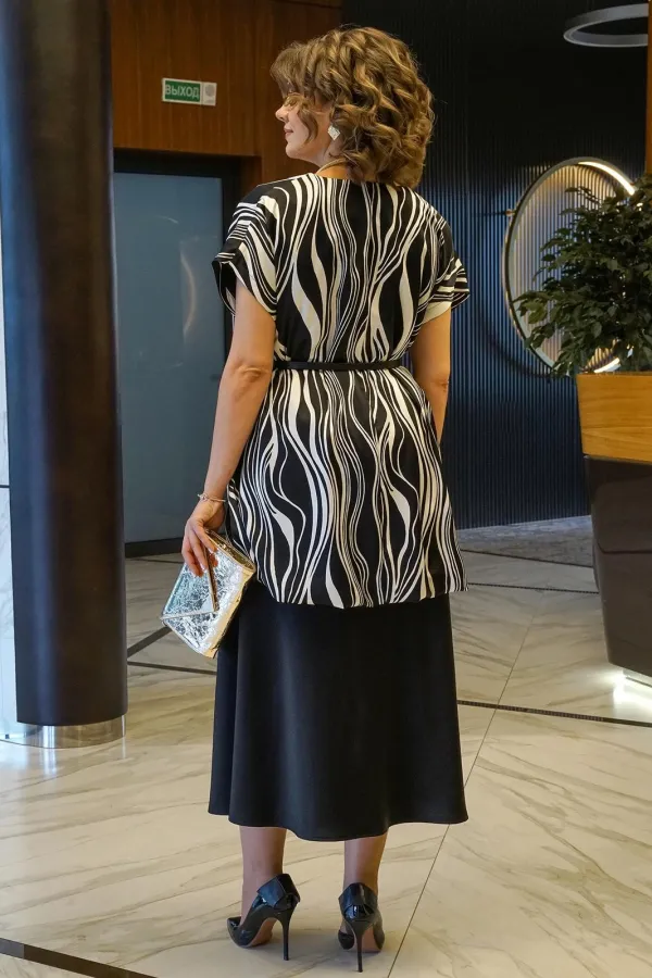 Комплект женский 2-х предметный состоит из блузона и платья.Блузон свободного силуэта, на подкладке, со спущенной линией плеча, без застёжки, с ремнём, с фигурной линией низа, с отлетными боковыми швами. Перед с имитацие... Читать далее...