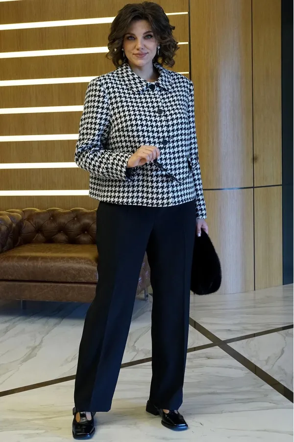 Комплект состоит из жакета и брюк. Жакет прямого силуэта, на подкладке, с застёжкой на петли, пуговицы. Перед с нагрудными выточками, прорезными карманами. Рукава втачные, двухновные. Воротник отложной