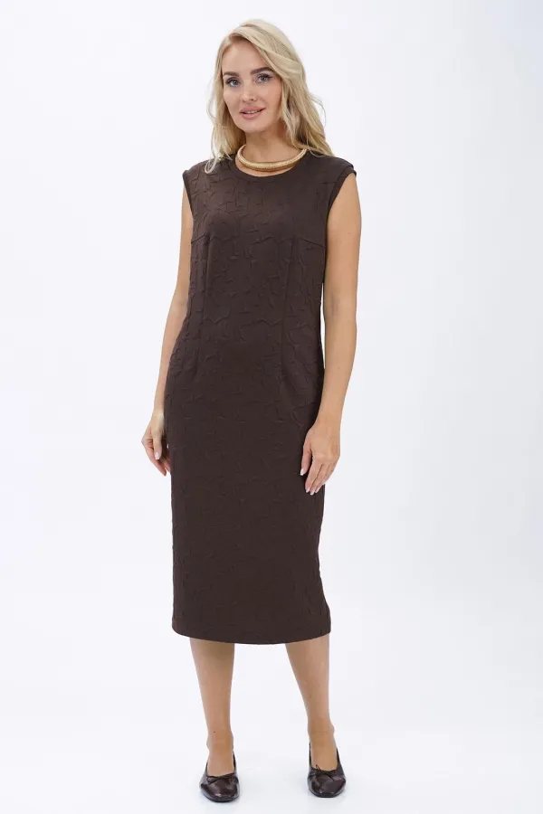 Платье полуприлегающего силуэта. По горловине и пройме бейка. Перед с нагрудными и талевыми выточками. Спинка со средним швом и талевыми выточками.