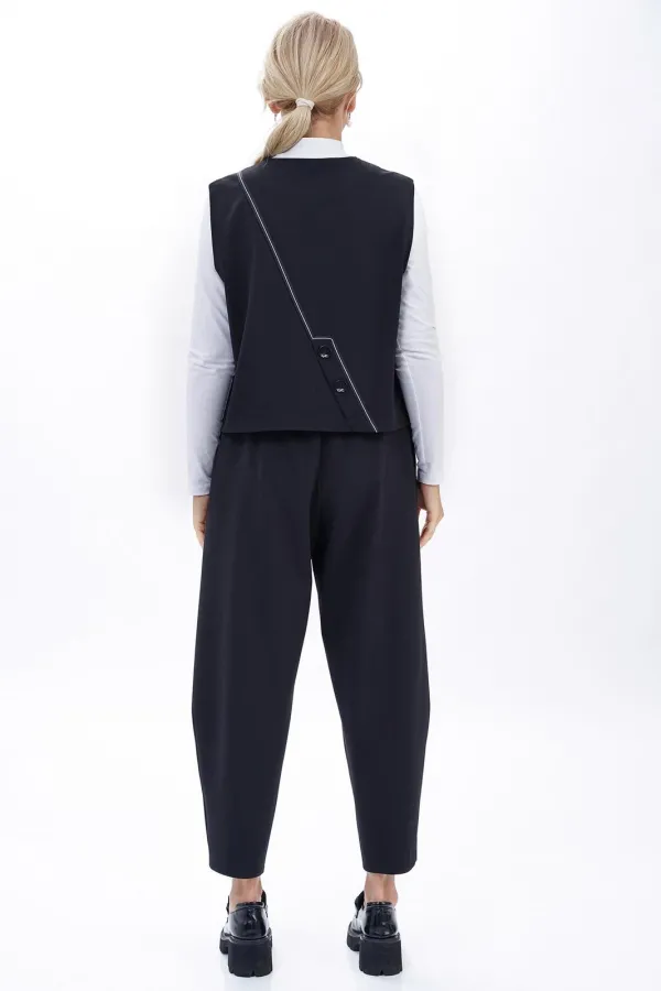 Жилет прямого, свободного силуэта, с застёжкой на петлю, пуговицу, правая часть переда с фигурной линией низа и декорирована нашивкой. Спинка с рельефным швом понизу переходящий в закрытую шлицу с пришивными пуговицами. По левой части переда, по спинки отделочная тесьма.