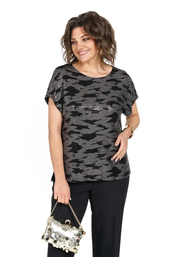 Блуза женская прямого, свободного силуэта, со спученной линией плеча, с разно-уровневым низом (спинка длиннее на 4,0см), по боковым с разрезами. Декорирована съёмным украшением.