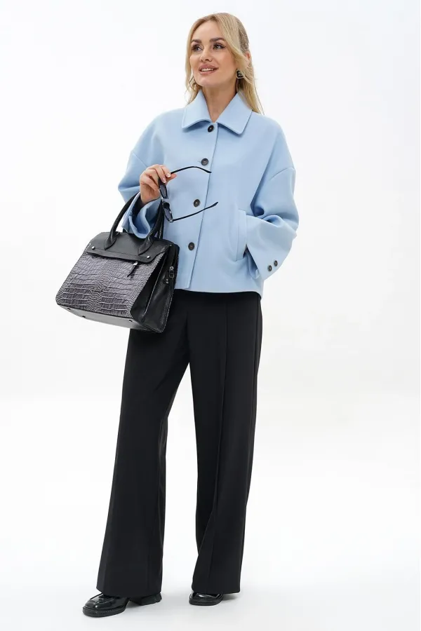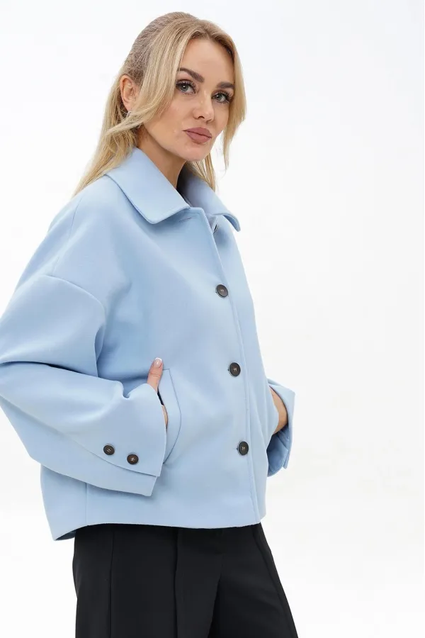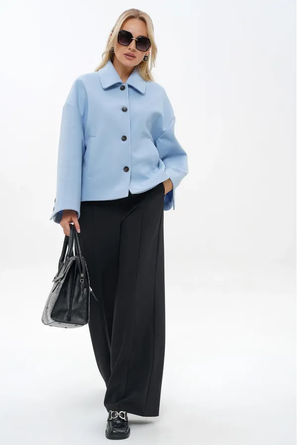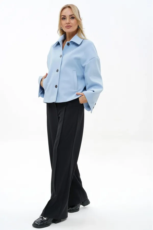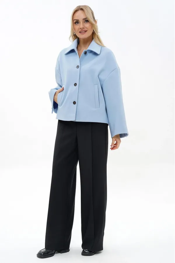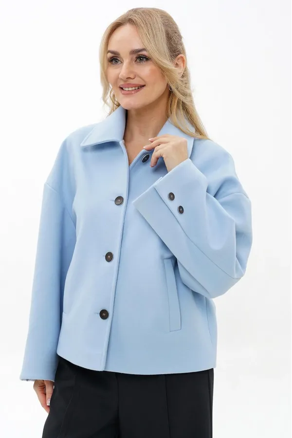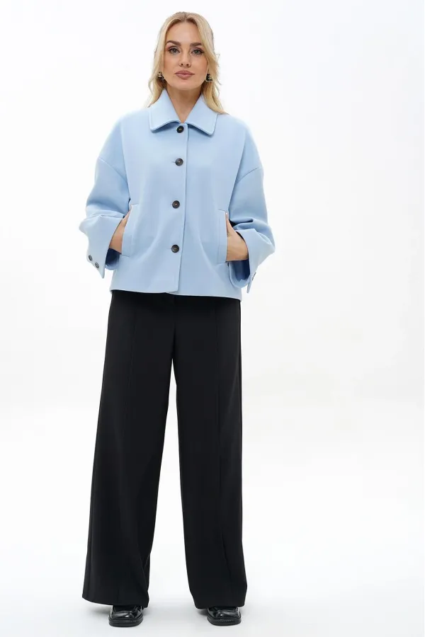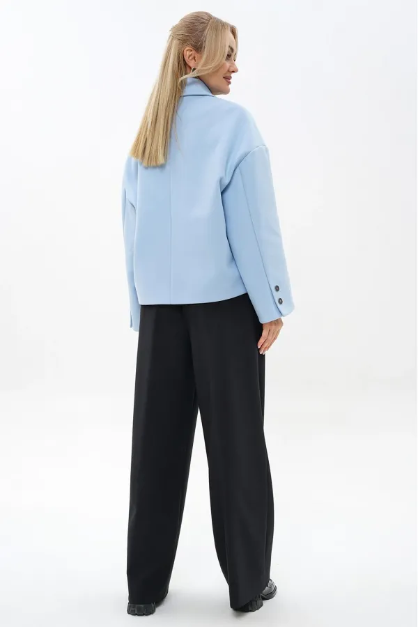 Жакет прямого, свободного силуэта, на подкладке, с центральной застёжкой на петли, пуговицы, со спущенной линией плеча. Перед с прорезными карманами с листочкой. Спинка со средним швом. Рукава втачные, двух-шовные, длинные, в локтевом шве шлица декорированная пуговицами. Воротник отложной.