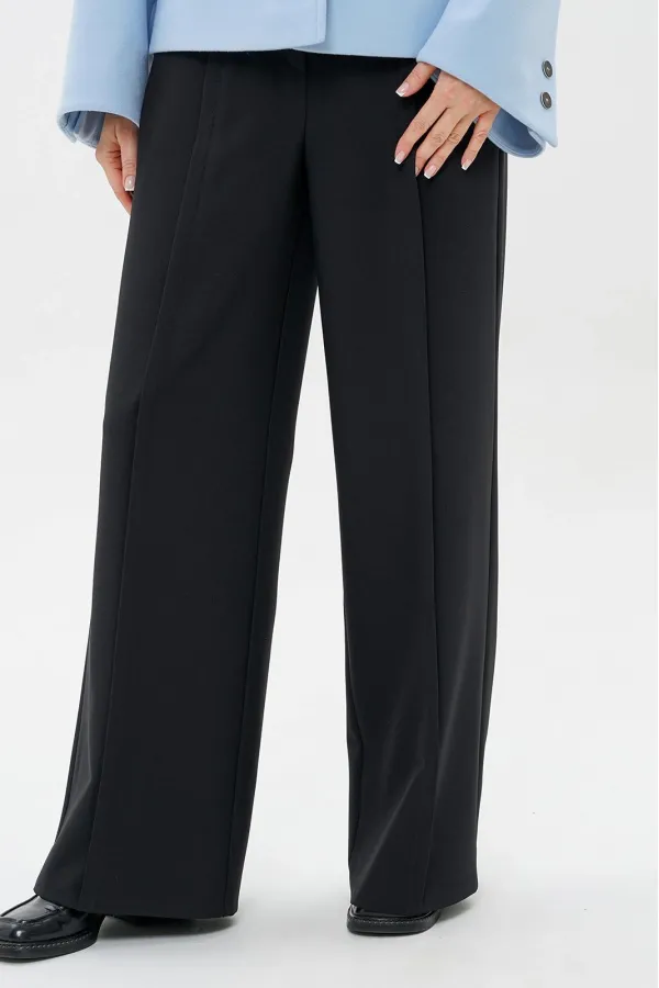 Брюки прямого силуэта, на притачном поясе со шлёвками, с застёжкой типа «гульфик» на молнию и по краю пояса на петлю, пуговицу, в боковых швах карманы. Передние части с отстроченными складками. Задние части с талевыми выточками.