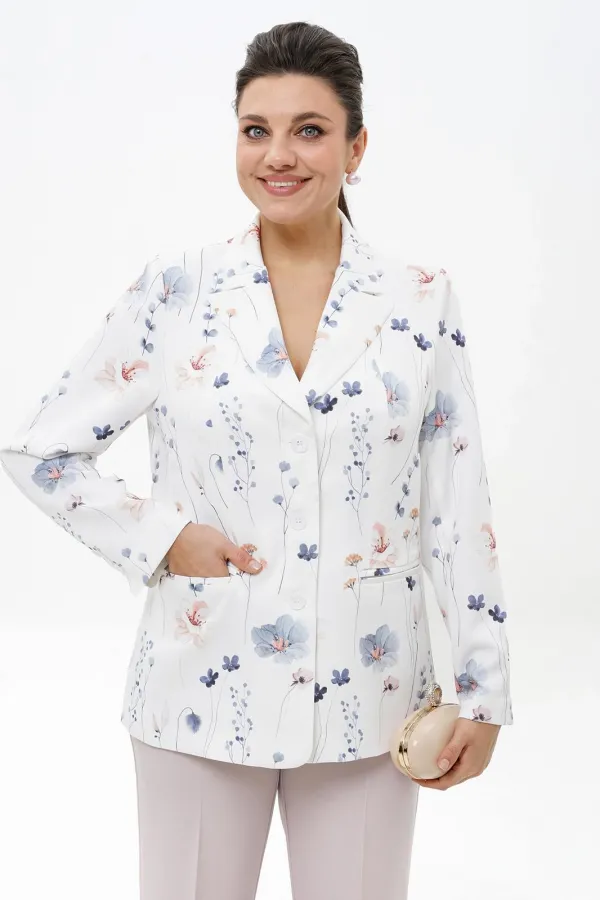 Жакет полуприлегающего силуэта, частично на подкладке (перед, спинка), со смещёнными к спинке боковыми швами, с застёжкой на петли и пуговицы. Перед с отложными лацканами, с рельефными швами, с отрезным бочком, прорезными карманами с двумя обтачками. Спинка со средним швом. Рукава втачные, двухшовные, длинные, локтевой шов заканчивающийся шлицей декорированная пуговицами.