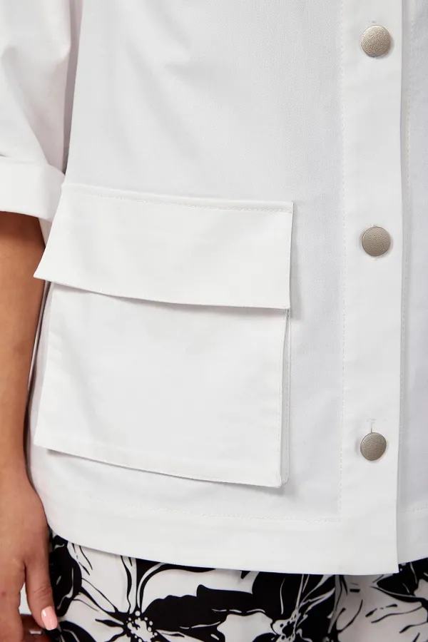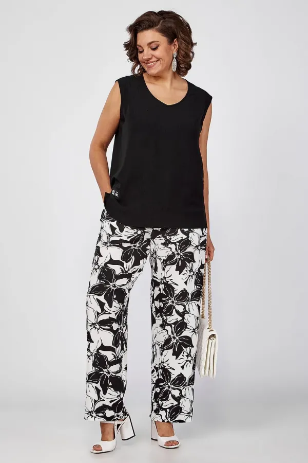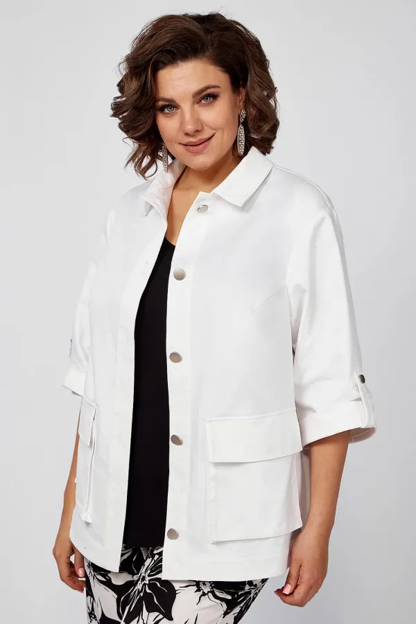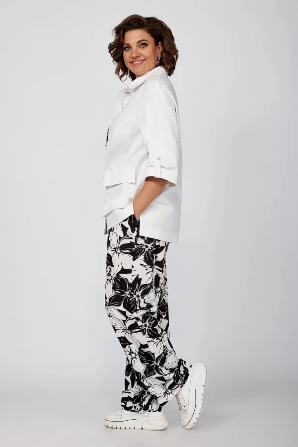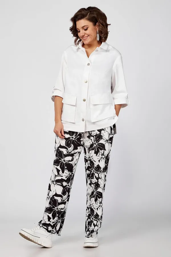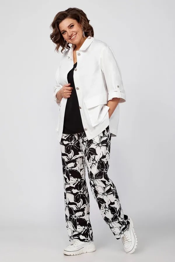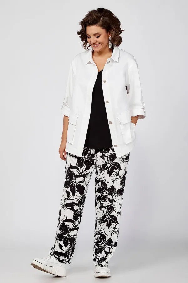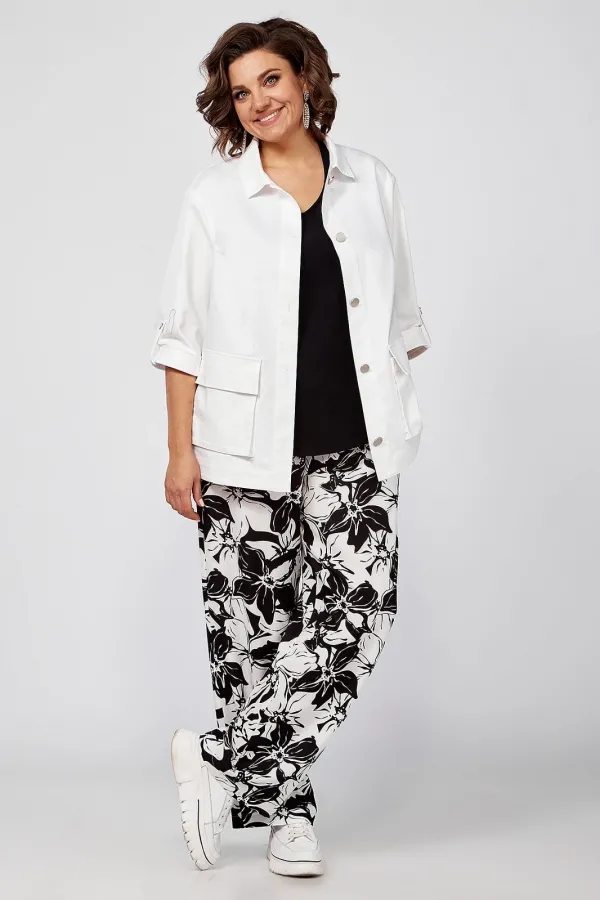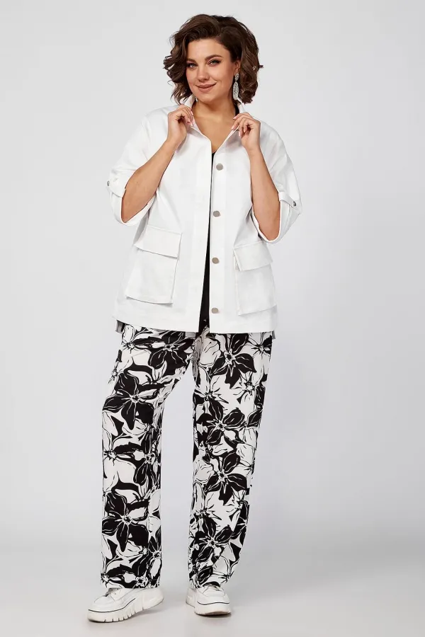 Стильный, современный, трендовый комплект с брюками для повседневной носки, торжественного мероприятия, в офис, школу или на прогулку. Приобретая один комплект, Вы покупаете несколько образов, каждая единица которого универсальна, поэтому может сочетаться со многими вещами из Вашего гардероба. Стильный вариант для красивого женского образа – сочетание белого джинсового жакета с брюками прямого кроя из принтованной ткани и контрастной майкой. Жакет-куртка прямого кроя с рельефными швами и кокетками по переду и спинке. Накладные карманы с клапанами и декоративные металлизированные пуговицы - узнаваемые нотки вневременной джинсовой мелодии. В рукавах предусмотрены паты с пуговицей, что позволяет сделать рукава короче. Жакет просто необходим при создании как романтического, так и спортивного образа. Майка с рукавом «крылышко», горловина углубленная V-образной формы. Брюки прямого кроя с боковыми карманами и поясом частично на резинке. Не упустите возможность приобрести брючный комплект с большим выбором размеров и ощутить комфорт в носке качественной и стильной одежды!