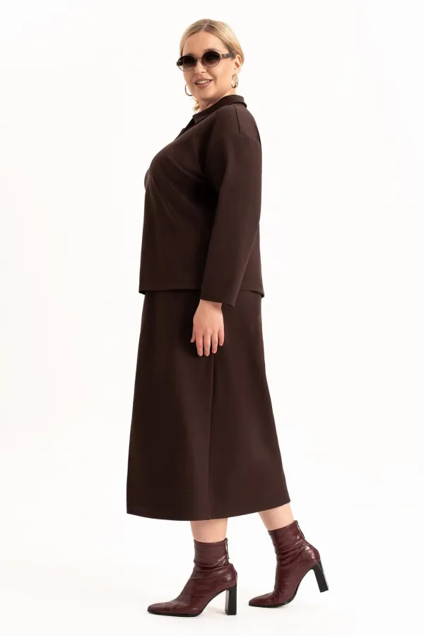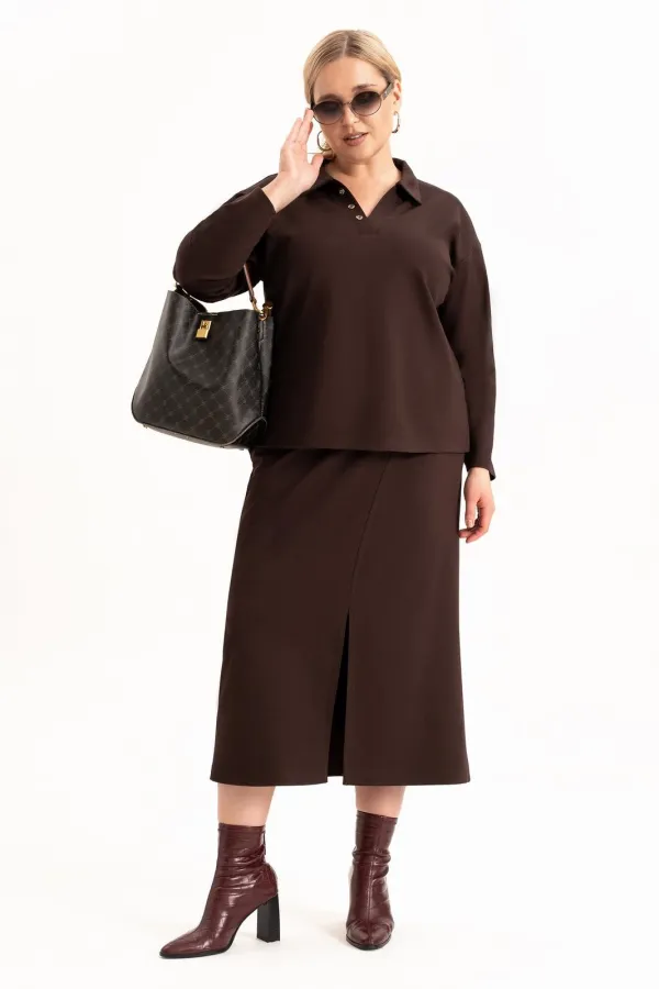 Стильный женский трикотажный костюм с юбкой станет настоящей находкой для каждой современной модницы. Удобный и практичный женский костюм оверсайз прекрасно подходит для любого типа фигуры, помогая выгодно скрыть недостатки и подчеркнуть достоинства. Приталенный силуэт трикотажной юбки с высокой посадкой, а также свободный крой свитшота сделает образ лаконичным, поможет всегда оставаться в тренде. Неповторимый стиль и удивительный комфорт умело сочетаются в этом женском костюме с юбкой. Женский костюм отлично подходит для повседневной носки, а также для более формальных ситуаций. Этот костюм идеально подходит как для офисной среды, так и для обеденного свидания или других повседневных мероприятий. Вы сможете легко создать разнообразные образы, изменяя аксессуары и обувь. В нем каждая сможет чувствовать себя комфортно. Удобный крой позволит не сковывать движения, при этом полноценно облегая силуэт женской фигуры. Костюм выполнен с учетом последних модных тенденций, что обеспечивает его стильный дизайн. Высококачественный трикотажный материал »лакоста», используемый при создании, придает костюму особую мягкость и удобство во время носки. Юбка с разрезом по цетру переднего полотнища и боковыми карманами добавляет нотку женственности и элегантности к образу. Горловина свитшота V-образная с обработанными планками и воротником, с боковыми разрезами и пришивным декором. Свитшот оверсайз отличается не только свободным кроем, но и имеет спущенную линию рукава, выгодно скрывая мельчайшие недостатки женской фигуры.