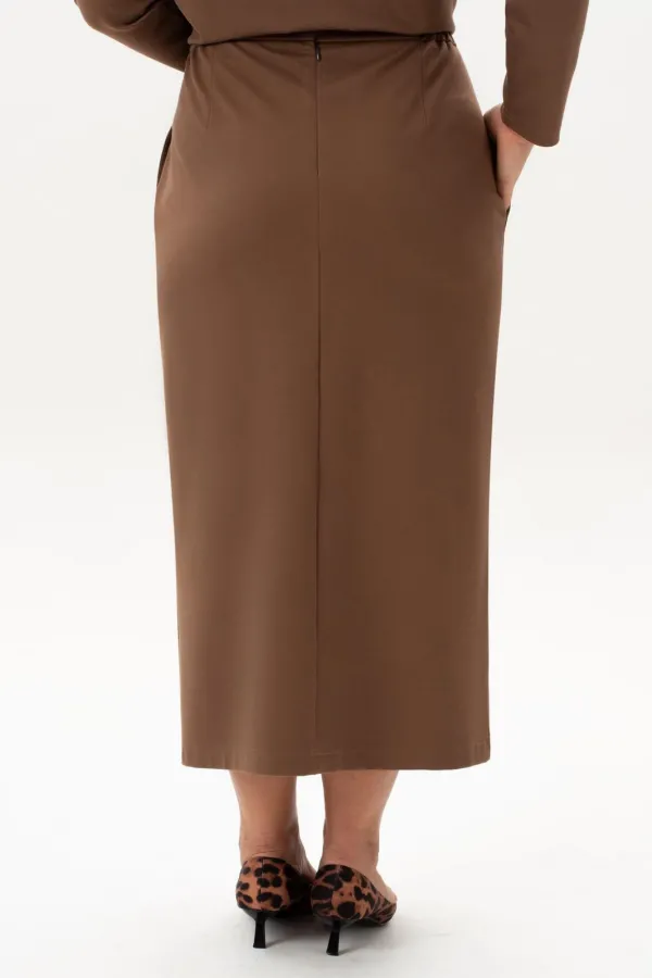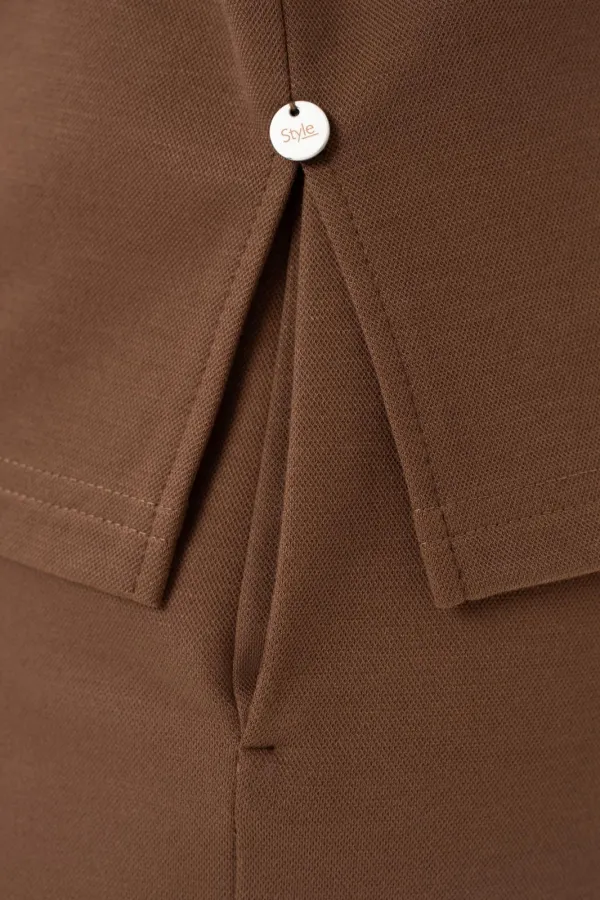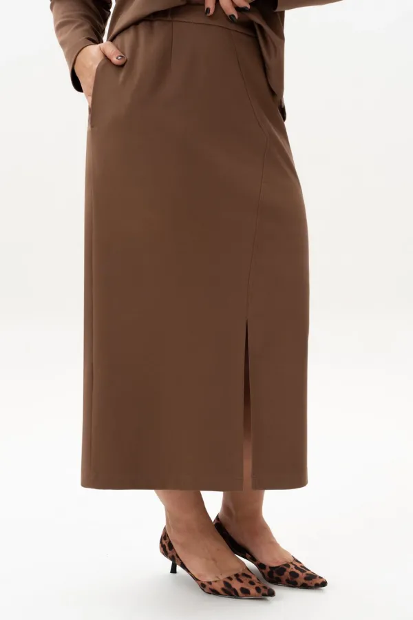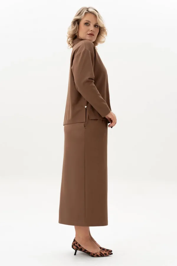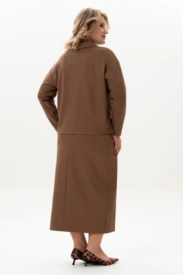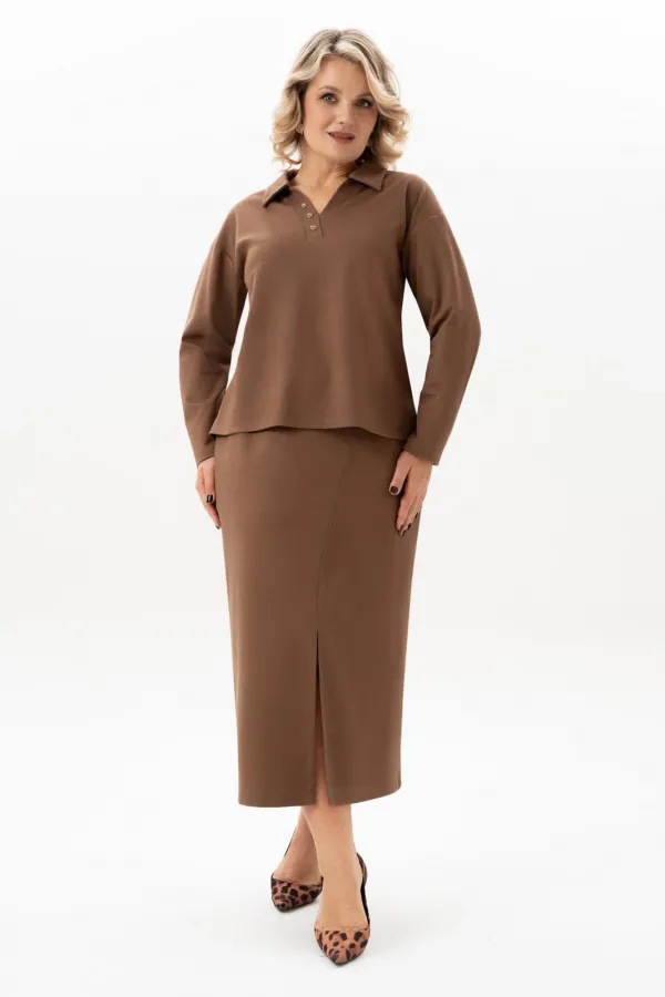 Стильный женский трикотажный костюм с юбкой станет настоящей находкой для каждой современной модницы. Удобный и практичный женский костюм оверсайз прекрасно подходит для любого типа фигуры, помогая выгодно скрыть недостатки и подчеркнуть достоинства. Приталенный силуэт трикотажной юбки с высокой посадкой, а также свободный крой свитшота сделает образ лаконичным, поможет всегда оставаться в тренде. Неповторимый стиль и удивительный комфорт умело сочетаются в этом женском костюме с юбкой. Женский костюм отлично подходит для повседневной носки, а также для более формальных ситуаций. Этот костюм идеально подходит как для офисной среды, так и для обеденного свидания или других повседневных мероприятий. Вы сможете легко создать разнообразные образы, изменяя аксессуары и обувь. В нем каждая сможет чувствовать себя комфортно. Удобный крой позволит не сковывать движения, при этом полноценно облегая силуэт женской фигуры. Костюм выполнен с учетом последних модных тенденций, что обеспечивает его стильный дизайн. Высококачественный трикотажный материал »лакоста», используемый при создании, придает костюму особую мягкость и удобство во время носки. Юбка с разрезом по цетру переднего полотнища и боковыми карманами добавляет нотку женственности и элегантности к образу. Горловина свитшота V-образная с обработанными планками и воротником, с боковыми разрезами и пришивным декором. Свитшот оверсайз отличается не только свободным кроем, но и имеет спущенную линию рукава, выгодно скрывая мельчайшие недостатки женской фигуры.
