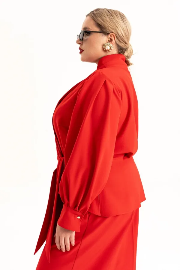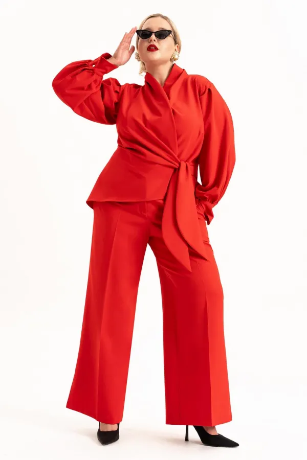 Элегантный женский костюм из ткани «марчано» стильный и универсальный наряд для различных мероприятий. Модель двойка сочетает в себе современные тенденции 2025-26 года с классическими акцентами. Подходит как для офиса, так и для особых случаев ( новый год, корпоративы, свадьбы или дни рождения) обеспечивая комфорт и уверенность в себе. Брюки с широкими штанинами палаццо выгодно подчеркивают женственные формы, а свободный крой обеспечивает удобство в любой ситуации. Этот костюм больших размеров идеально подойдет для прохладного времени года благодаря легкому материалу и возможности сохранить тепло. Текстура ткани добавляет изысканности и роскоши, делая образ особенно привлекательным на особых событиях. Благодаря универсальному дизайну, костюм можно успешно сочетать с различными элементами гардероба, создавая разнообразные стили от официального до повседневного. На брюках обработаны карманы в боковых швах, по талии пояс с застежкой на молнию и частично на резинке. Жакет с отрезной баской и воротником стойкой переходящей в борта. Застежка на потайную петлю и пуговицу и на завязки. Рукав длинный, втачной на манжете. По окату рукава обработаны складки. Доступен в различных размерах, в том числе и для женщин пышных форм, этот костюм позволит каждой леди подобрать идеальный вариант. Красный цвет костюма подчеркнут вашу индивидуальность и хороший вкус. Независимо от того, выберите ли вы его для офиса или вечера, этот костюм станет верным спутником в создании вашего стильного образа.