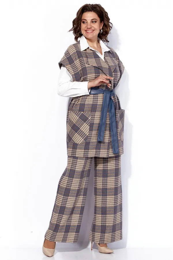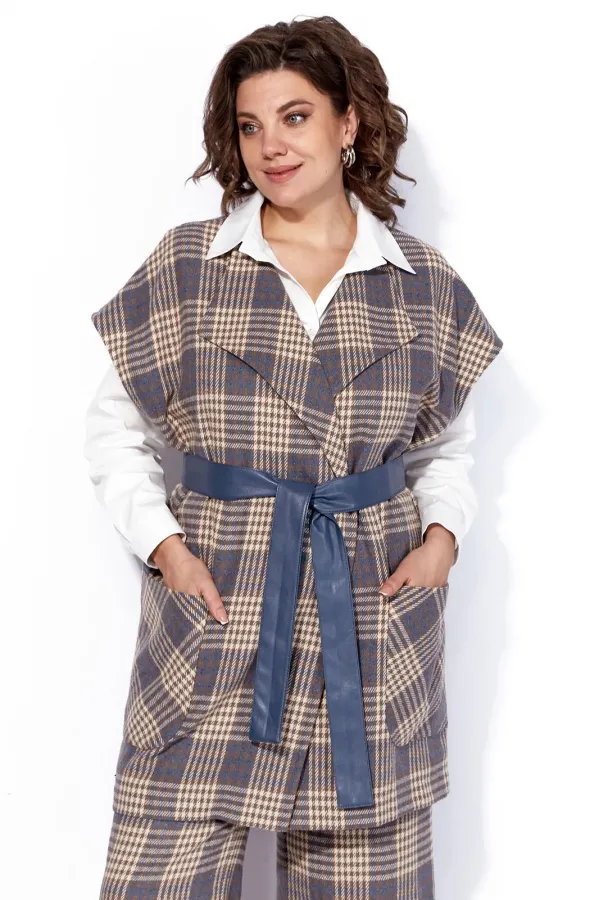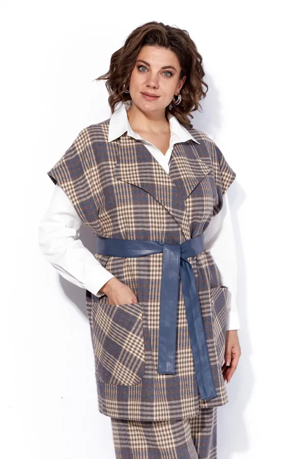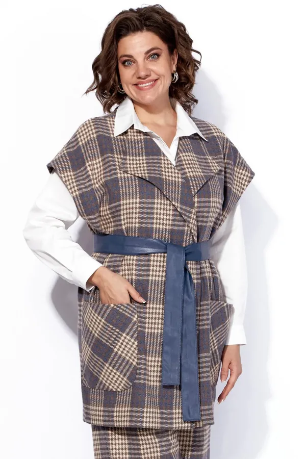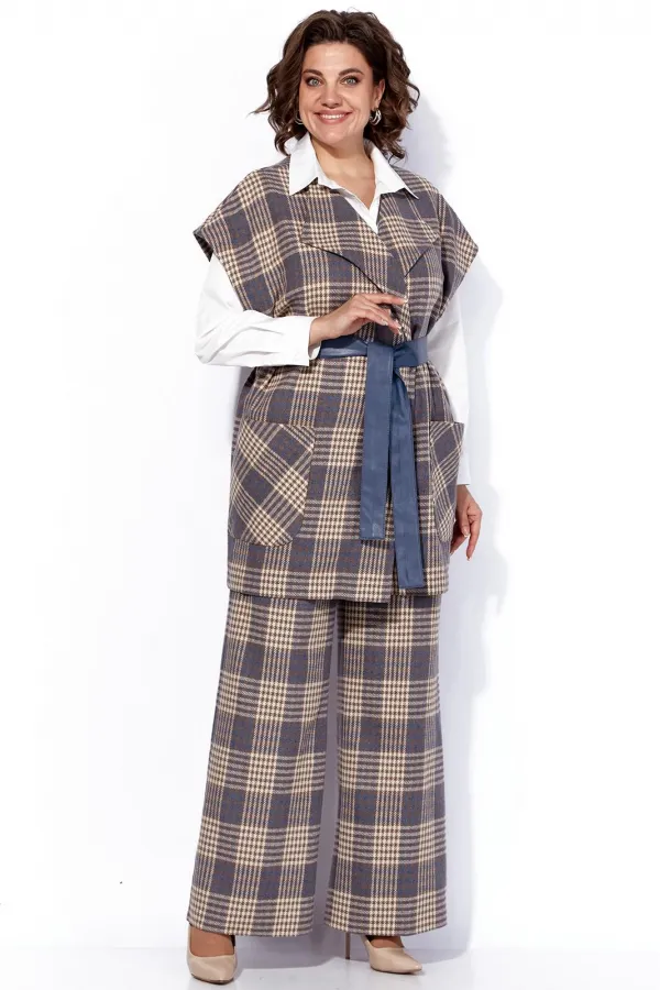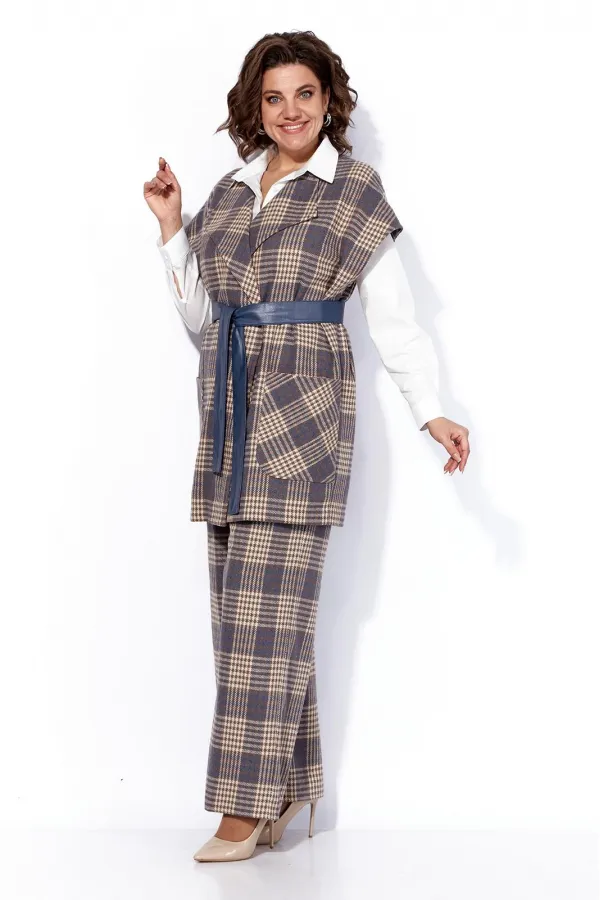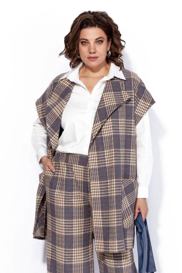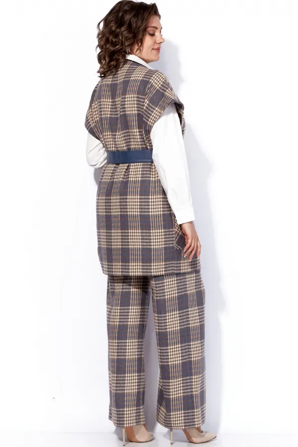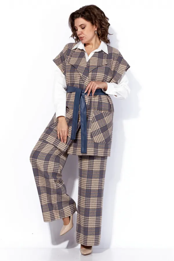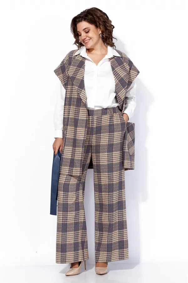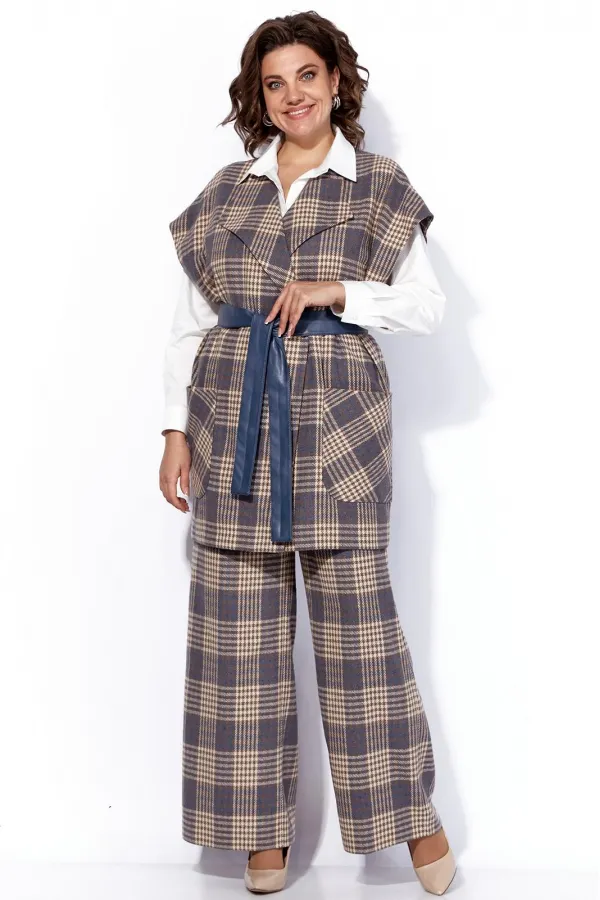 Бренд белорусской женской одежды больших размеров Anastasia представляет комплект двойку. Костюм женский 2-х предметный (жилет, брюки) станет отличным дополнением к Вашему гардеробу. Подойдет для повседневной носки (работа, офис, прогулки). Достаточно дополнить его соответствующими предметами из вашего гардероба: блузка, майка, водолазка, гольф, свитер, лонгслив, свитшот. Жилет женский из текстильной ткани в клетку без подкладки. Модель прямого силуэта с закпахом, со съемным поясом из эко кожи. По полочке идут накладные карманы. Брюки прямые, пояс на резинке, по бокам карманы. Благодаря своему крою и фасону костюм подчеркивает женственные формы и скрывает то, что должно быть незаметным. Это повседневный вариант на каждый день для занятий в школе или для офиса, на работу или на прогулку. Наденьте его на деловую встречу, официальное мероприятие, школьное торжество. Модель подойдёт для образа в университет или колледж. Этот предмет одежды подчеркнет вашу элегантность и сделает образ более женственным. Длина по спинке: (50-58)-90см. Длина брюк (50-54) -100см, (56-58)-103см