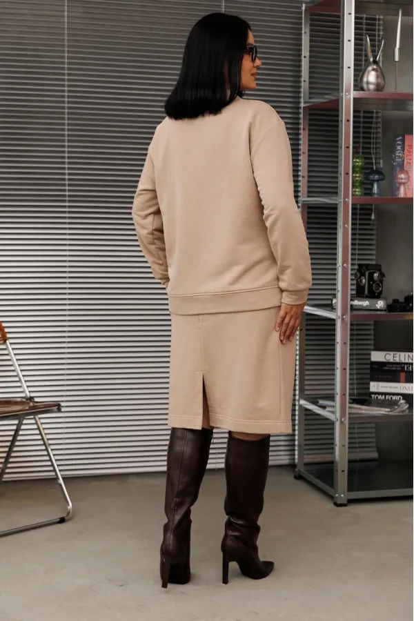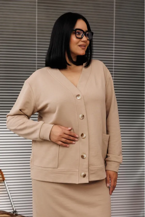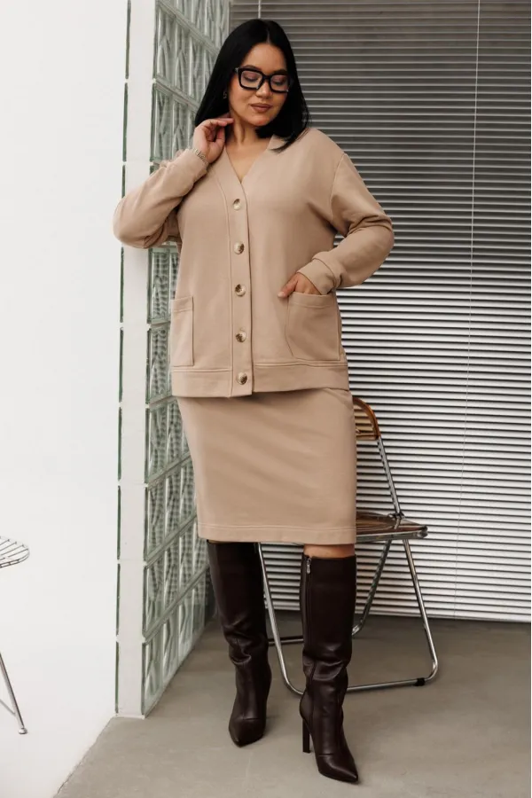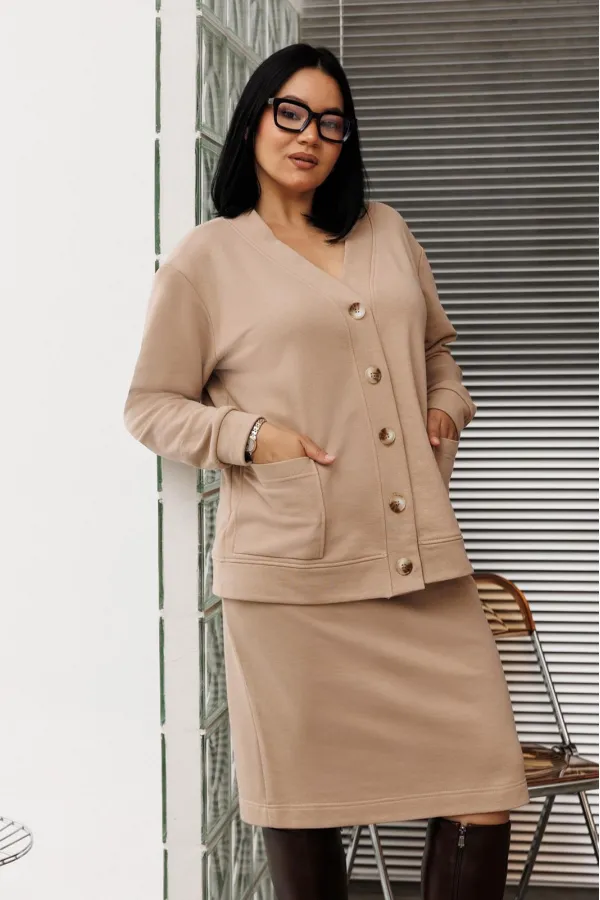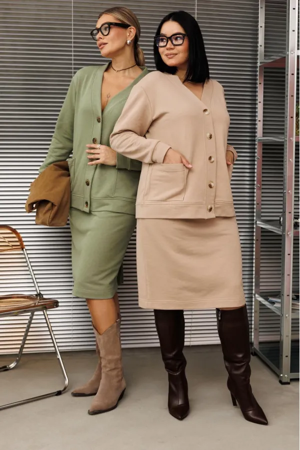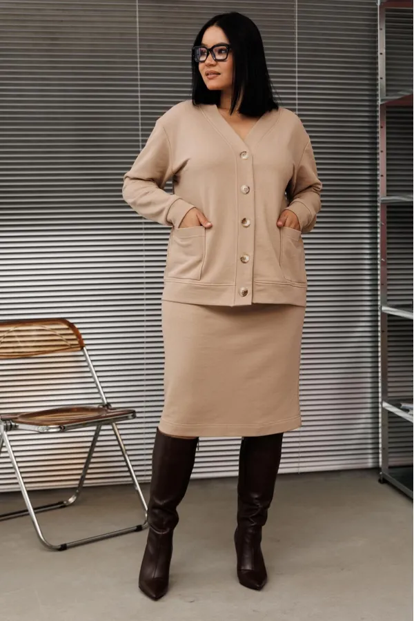 Шикарный трикотажный женский костюм от бренда Anastasia, идеальный для любого случая. Этот костюм сочетает в себе элегантность и комфорт, что делает его подходящим как для деловых встреч или прогулок. Комплект состоит из кардигана и юбки. Кардиган прямого силуэта со спущенным плечом. По низу спинки и полочки идет отрезной пояс. Застежка- планка с пуговицами. По полочке идут накладные карманы. По низу рукава- манжет. Юбка зауженная к низу по спинке идет разрез, пояс отрезной на резинке. Стильный костюм отлично подойдет для долгих прогулок или для работы, для офиса. Юбка -миди создает чувственный образ благодаря своей длине, придающей женственность и элегантность вашему образу. Отдельный части костюма легко будут сочетаться с вещами из Вашего гардероба. Модель можно отнести к стилю спортивный кэжуал, оверсайз, спортивный шик. Костюм можно носить с кроссовками, высокими сапогами или ботинками. Обязательно добавьте наш бренд в избранное и следите за новинками, распродажами, скидками и акциями! Хороших покупок от «Анастасия». Длина (по спинке):(50-54)- 56см, (56-60)-59 см. Длина рукава с манжетой: (50-54)-56см, (56-60)-58 см. Длина юбки: (50-54):-59см, (56-60)-62см.