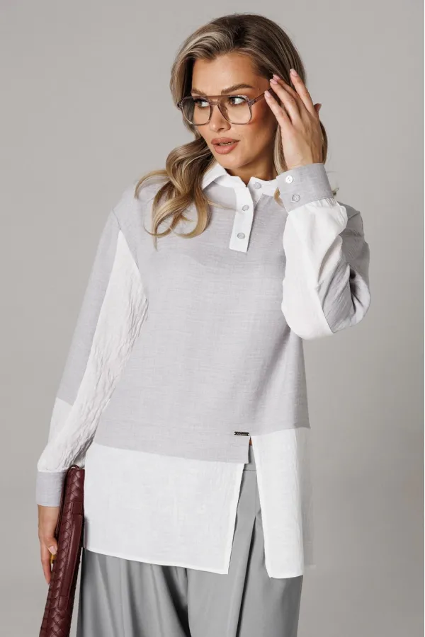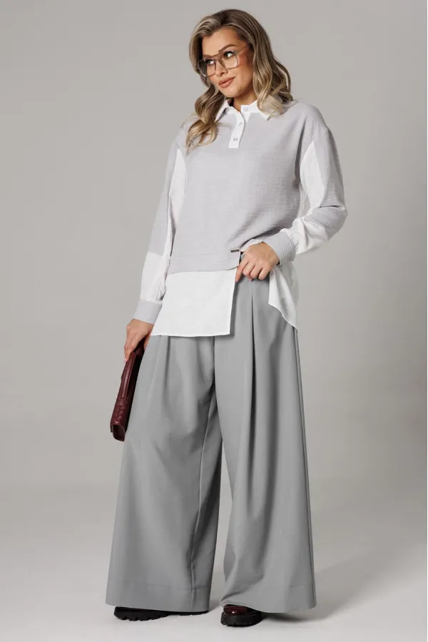 Комплект из костюмной ткани создан для тех, кто ценит комфорт и элегантность в каждой детали. В комплект входит блузка и штаны палаццо. Оверсайз крой придаёт костюму особый шарм и дает свободу движений. Высокая посадка и резинка по поясу подчёркивает талию и делает силуэт более изящным. Благодаря свободному крою костюм подойдёт для разных типов фигуры. Он подчеркнёт вашу индивидупльность. Блузка прямого силуэта, застежка на планку и пуговицы. Воротник на отрезной стойке. По полочке идет ассиметричный подрез со вставками из 2-х видов однотона и разрезом. Плечо спущенное, рукав длинный со вставками, на манжете. По спинке идет кокетка и встречная складка. Брюки полаццо , прямые с односторонней складкой и запахом по центру. По низу брюк широкая подгибка. Пояс на резинке . В качестве декора- брендированная металлическая нашивка по подрезу полочки. Длина по спинке (50-54) - 74 см, (56-60) - 76 см. Длина рукава (с манжетой): (50-54) - 57 см, (56-60)-59см. Длина брюк: (50-54) - 97 см, (56-60) - 98см