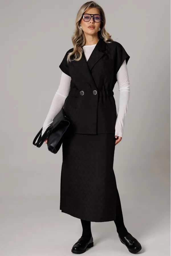 Бренд белорусской женской одежды больших размеров Anastasia представляет костюм двойку. Костюм женский 2-х предметный (жилет, юбка) из стеганной ткани станет отличным дополнением к Вашему гардеробу. Подойдет для повседневной носки (работа, офис, прогулки). Достаточно дополнить его соответствующими предметами из вашего гардероба: блузка, майка, водолазка, гольф, свитер, лонгслив, свитшот. Жилет прямого силуэта, со спущенным плечом. Может быть самостоятельным элементом гордерба. Застежка двухбортная, воротник английского типа. По полочке идет грудовая выточка из бокового шва, по спинке средний шов, по талии кулиска-резинка, по бокам -карманы. Юбка-макси, зауженная к низу, по бокам разрезы. Пояс отрезной на резинке. Благодаря своему крою и фасону костюм подчеркивает женственные формы и скрывает то, что должно быть незаметным. Это повседневный вариант на каждый день для занятий в школе или для офиса, на работу или на прогулку. Наденьте его на деловую встречу, официальное мероприятие, школьное торжество. Модель подойдёт для образа в университет или колледж. Этот предмет одежды подчеркнет вашу элегантность и сделает образ более женственным. Длина по спинке (48-52)-70см, (54-58)-71 см. Длина юбки (48-58) - 88см.