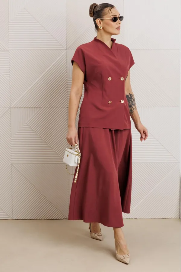 Бренд белорусской женской Anastasia представляет костюм двойку. Костюм женский 2-х предметный (жилет, юбка) из костюмной ткани станет отличным дополнением к Вашему гардеробу. Подойдет для повседневной носки (работа, офис, прогулки). Достаточно дополнить его соответствующими предметами из вашего гардероба: блузка, майка, водолазка, гольф, свитер, лонгслив, свитшот. Или акссесуарами: ремешок или пояс. Жилет полуприлегающего силуэта, со спущенным плечом. Может быть самостоятельным элементом гордерба. Застежка двухбортная. Воротник цельнокроеная стойка. По полочке идет грудовая выточка из бокового шва, по спинке средний шов. Юбка-макси, полусолнце. Пояс отрезной на резинке. По бокам - карманы. Акцентный элемент- золотые пуговицы. Благодаря своему крою и фасону костюм подчеркивает женственные формы и скрывает то, что должно быть незаметным. Это повседневный вариант на каждый день для занятий в школе или для офиса, на работу или на прогулку. Наденьте его на деловую встречу, официальное мероприятие, школьное торжество. Модель подойдёт для образа в университет или колледж. Длина по спинке (48-52)-72см, (54-58)-74 см. Длина юбки (48-58) - 94см.