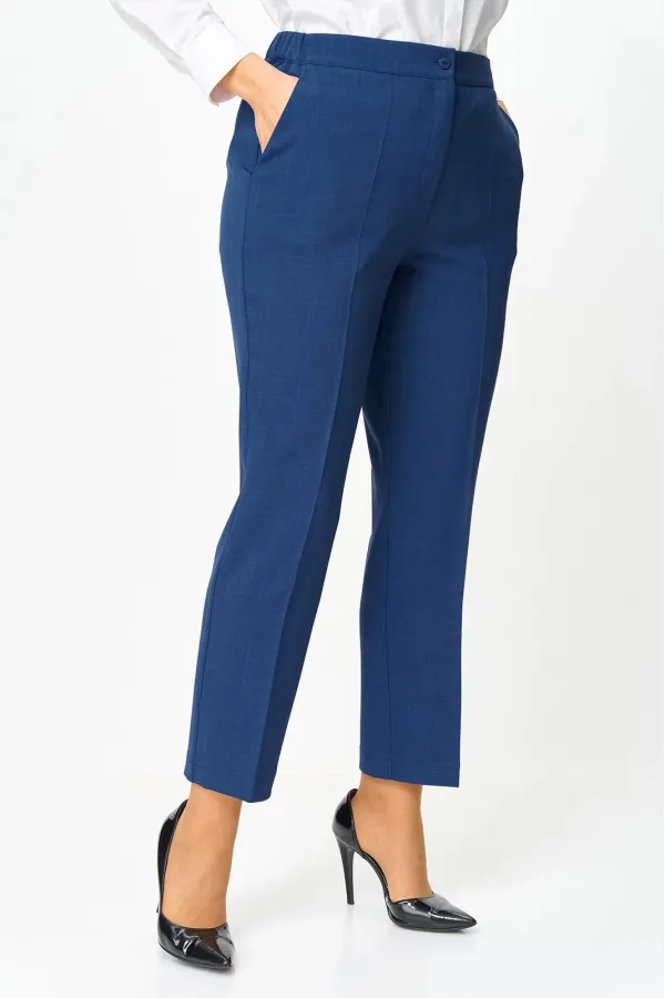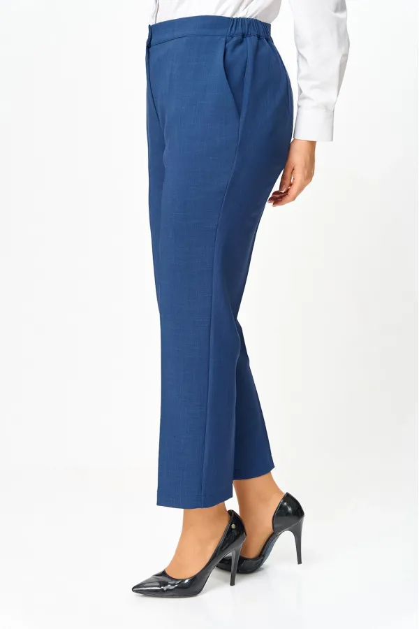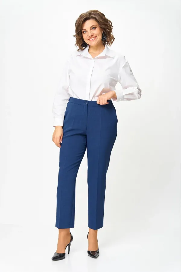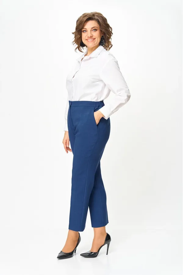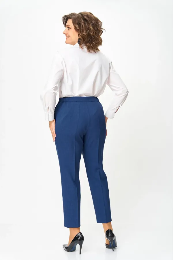 Брюки классические, длиной до косточки, со стрелками. Брюки прилегающие в области бедер и свободные в колене и по низу. По передним половинкам выполнены наклонные карманы, в среднем шве обработана застежка на молнию. По задним половинкам обработаны талиевые вытачки. Брюки на притачном поясе с эластичной тесьмой и застежкой на петлю и пуговицу.
