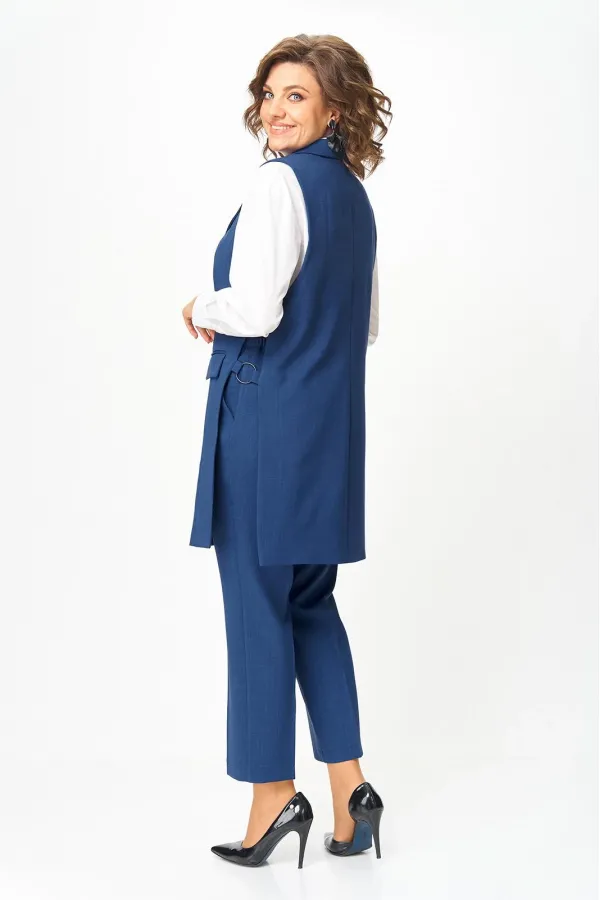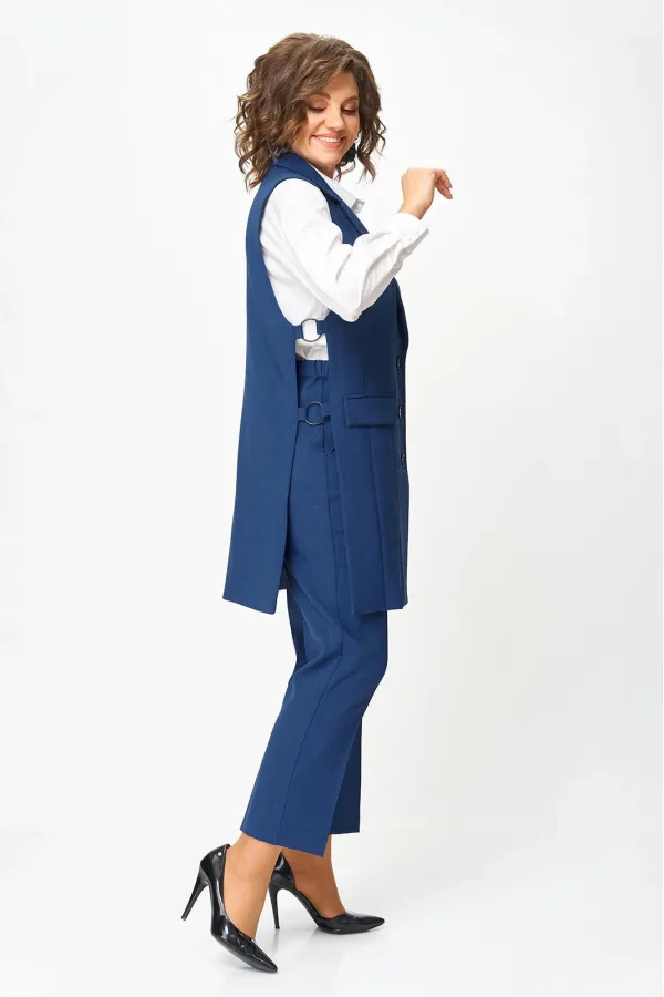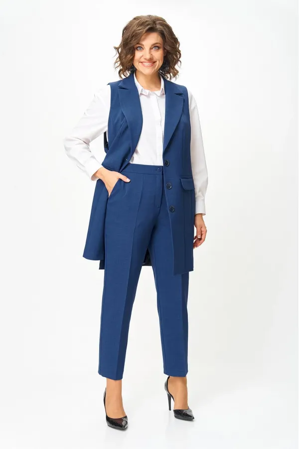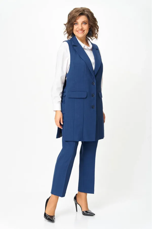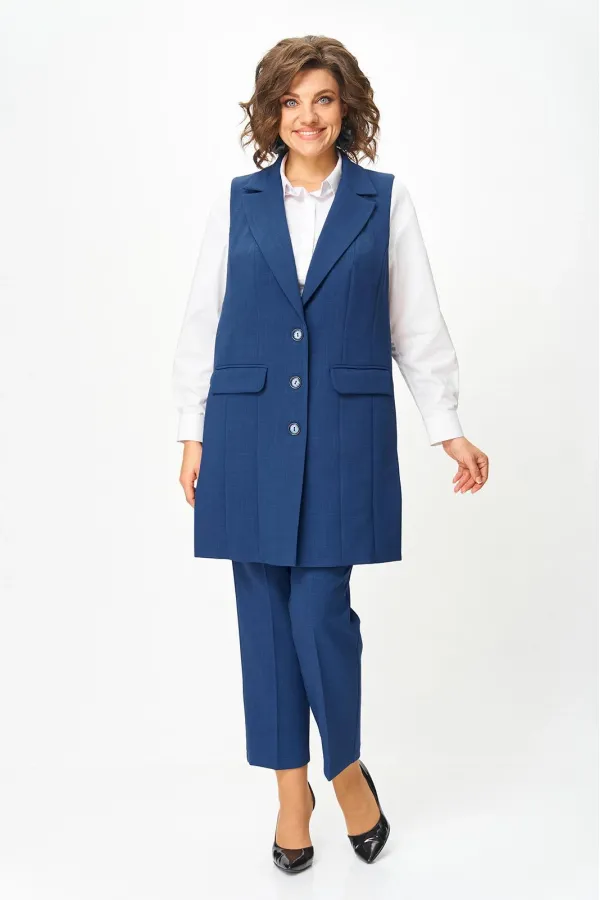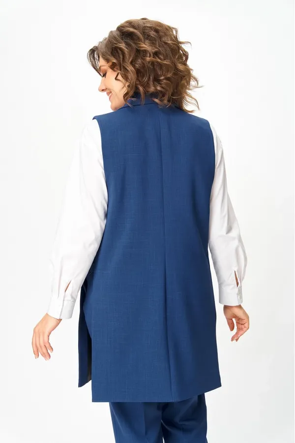 Костюм состоит из жилета и брюк. Костюм выполнен из однотонной ткани, жилет на подкладке. Жилет прямого силуэта, удлиненный. Полочка жилета с центральной застежкой на петли и пуговицы, вертикальными рельефами и прорезным... Читать далее...