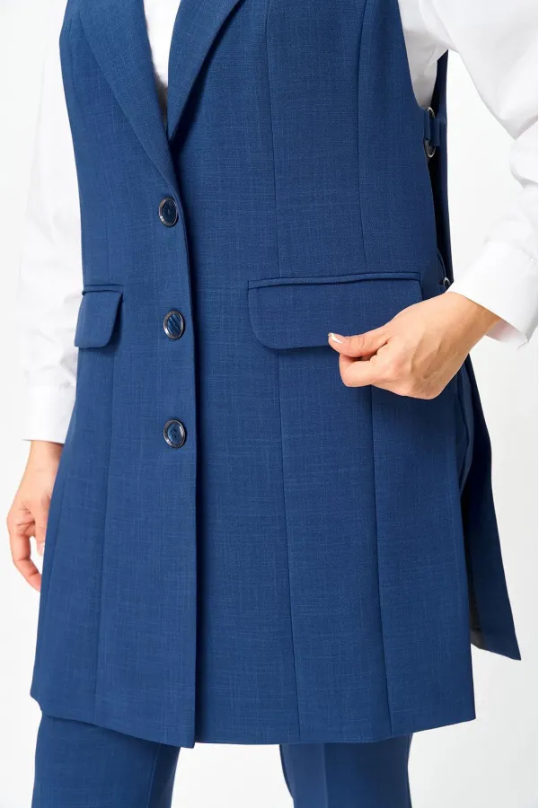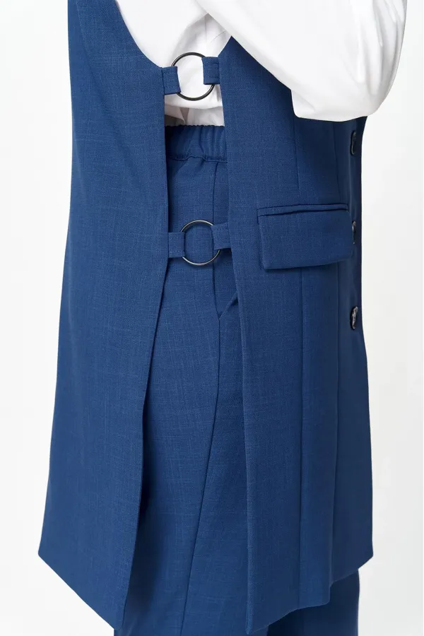 Жилет прямого силуэта, удлиненный. Полочка жилета с центральной застежкой на петли и пуговицы, вертикальными рельефами и прорезными карманами с клапанами. Горловина V-образной формы с отложными лацканами и воротником пиджачного типа. Спинка со средним швом. В боковых швах выполнен декоративный элемент в виде металлических колец крепящихся на петлях.