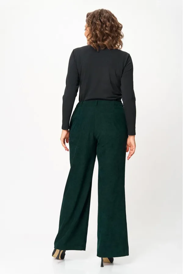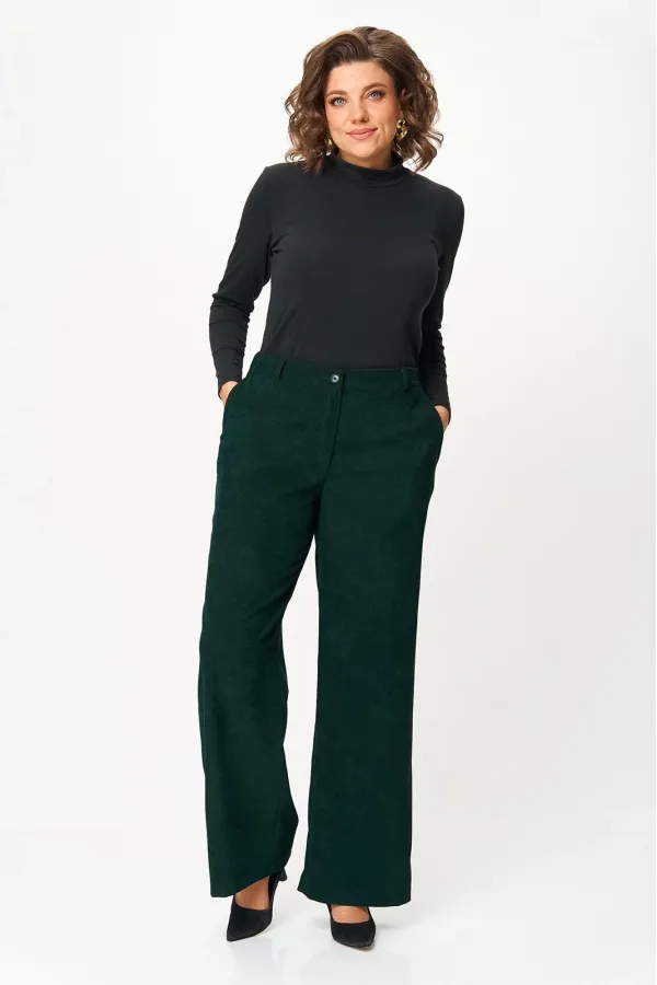 Брюки прилегающие по бедрам и свободные в области колена и по низу. На передних половинках выполнены наклонные карманы. По задним половинкам талиевые вытачки. В среднем шве передней половинки обработана застежка на молнию. Брюки на притачном поясе с эластичной тесьмой и застежкой на петлю и пуговицу.