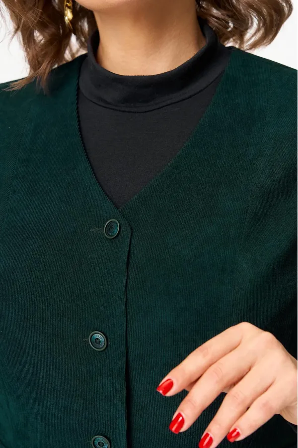 Жилет полуприлегающего силуэта, полочка жилета с вертикальными рельефами и прорезными функциональными карманами с листочкой. Горловина V-образной формы. Спинка со средним швом и вертикальными рельефами.