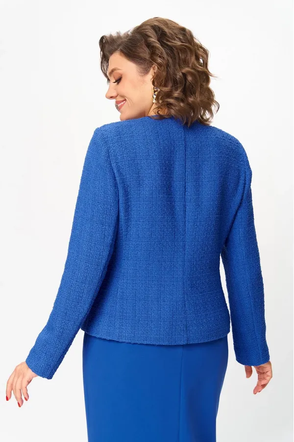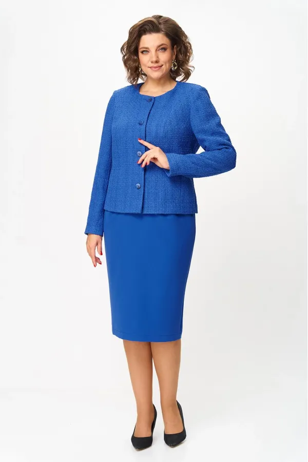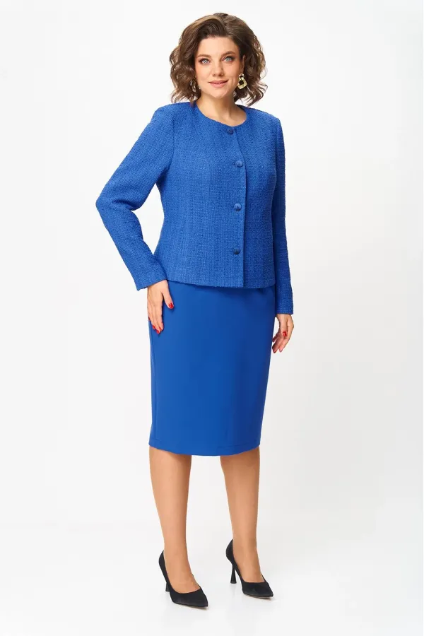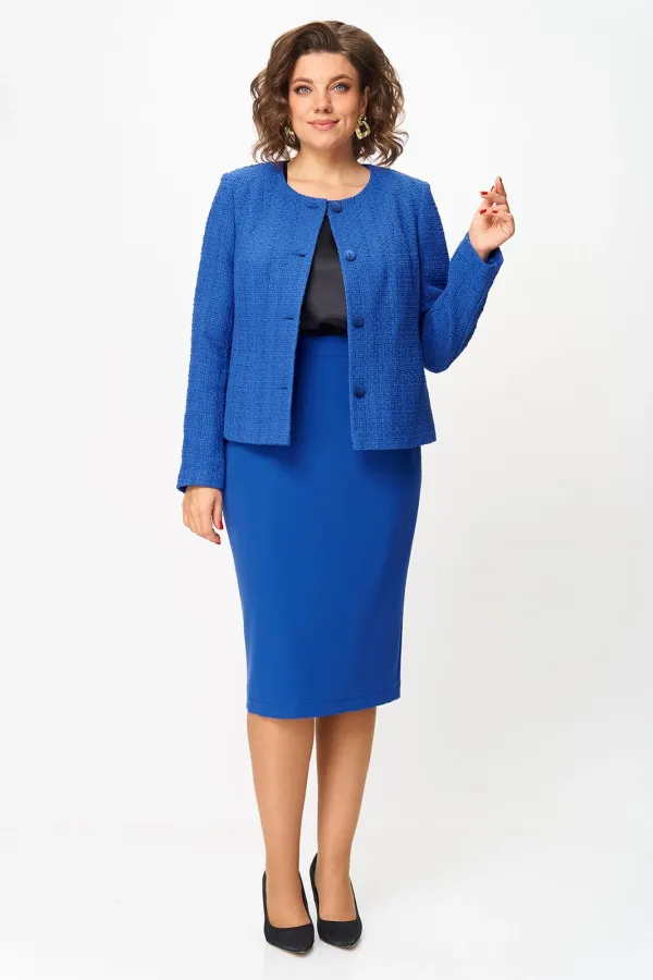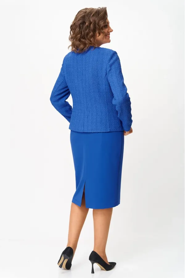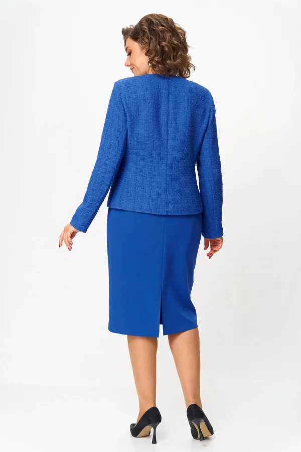 Комплект состоит из жакета и юбки. Жакет выполнен из твида, юбка из однотонной костюмной ткани.