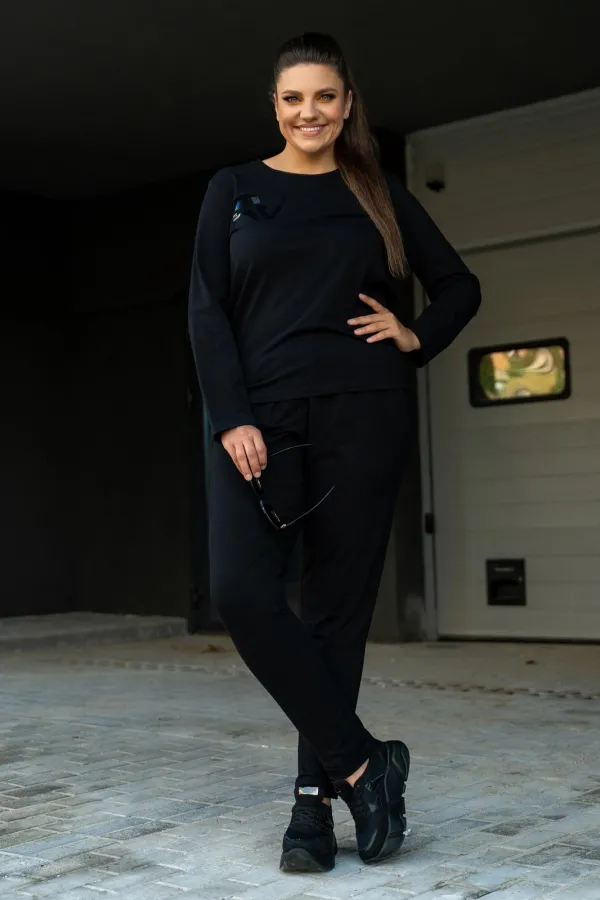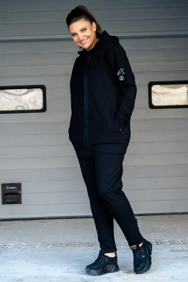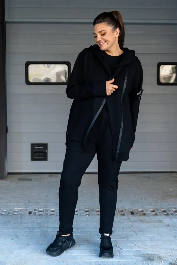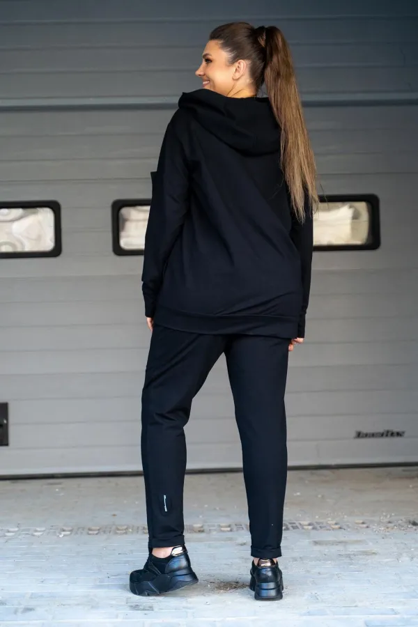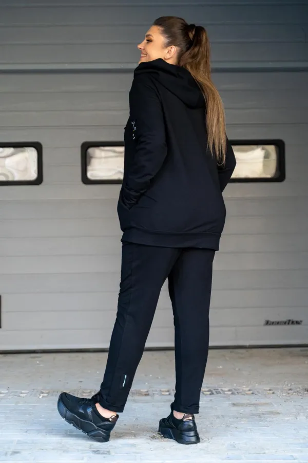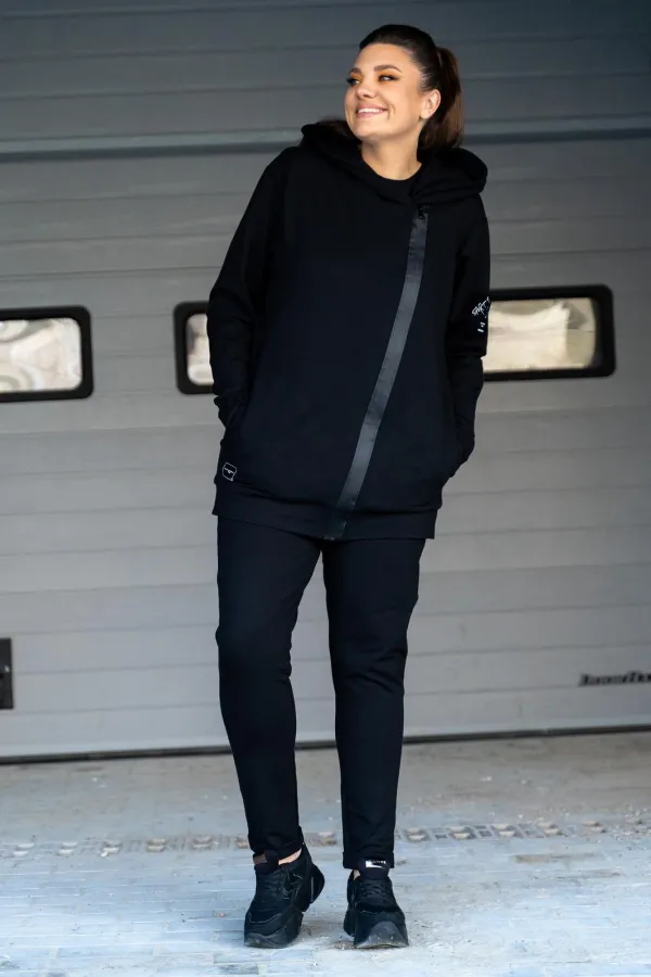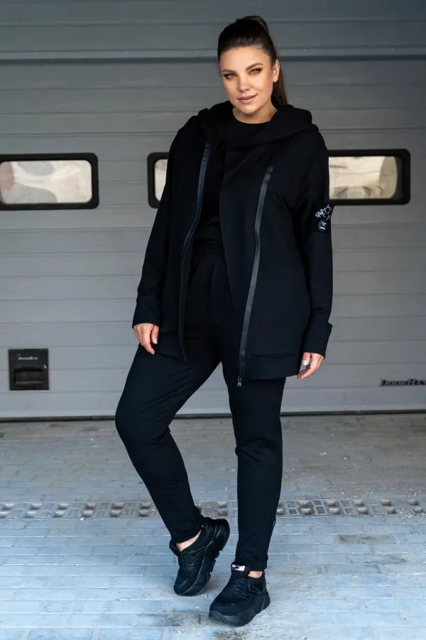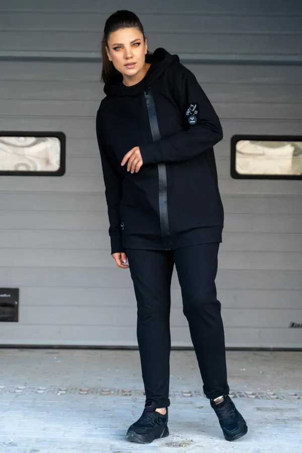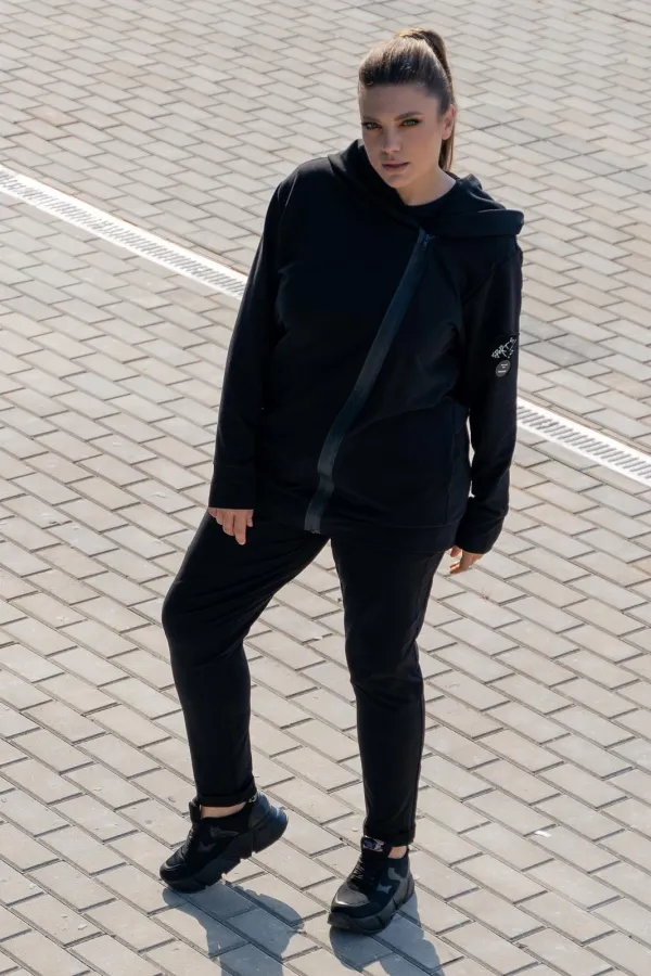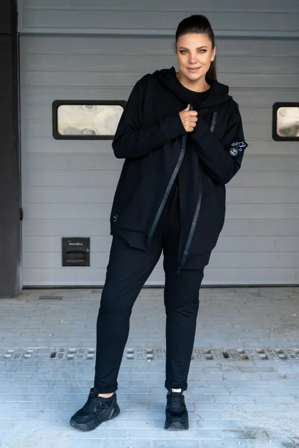 костюм женский спортивный современный, джемпер-косуха и брюки с подрезами и нашивками. Джемпер с асиметричной застёжкой на тесьму-молнию под кожу, с нашивками на правом кармане и на левом рукаве, с большим капюшоном, с к... Читать далее...