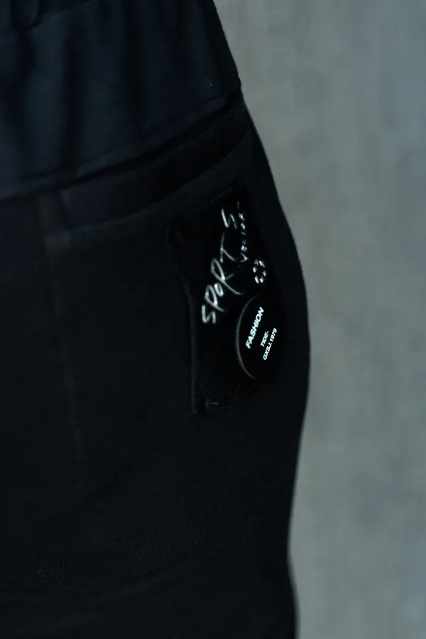 костюм женский спортивный современный, джемпер-косуха и брюки с подрезами и нашивками. Джемпер с асиметричной застёжкой на тесьму-молнию под кожу, с нашивками на правом кармане и на левом рукаве, с большим капюшоном, с карманами в шах, с втачными рукавами с притачными манжетами, по низу джемпера притачнойт пояс. Брюки на поясе с резинкой и протяжками с металлическими наконечниками, перед брюк с подрезами, в которых обработаны карманы, задние половинки с отрезными кокетками, и задними карманами. На брюках по низу нашивка и на заднем кармане.