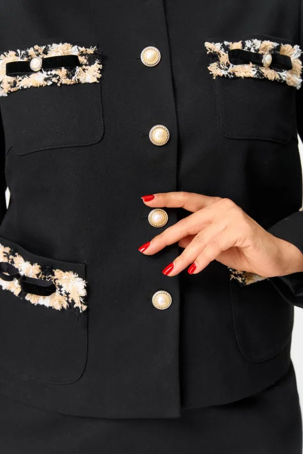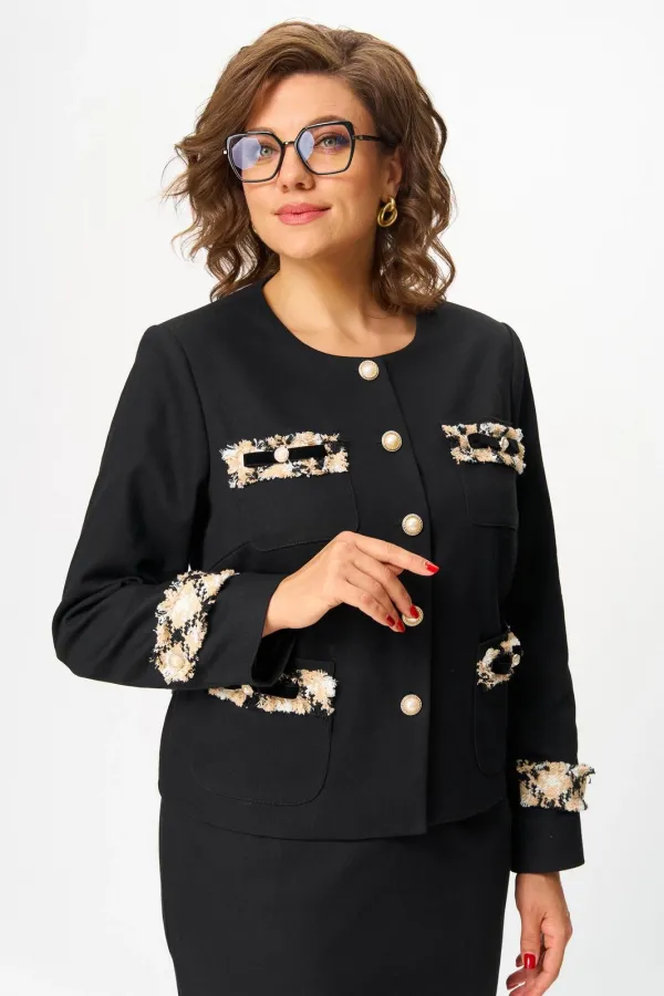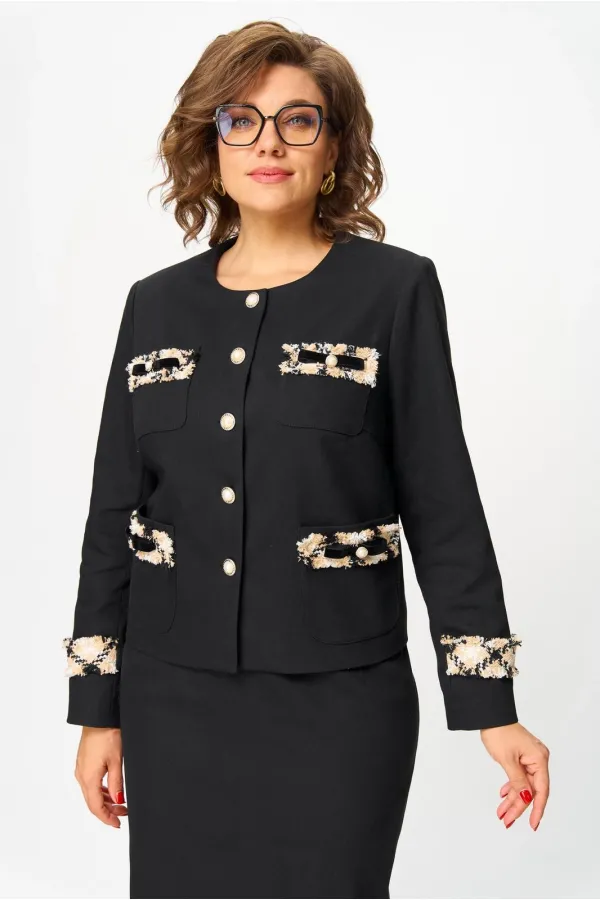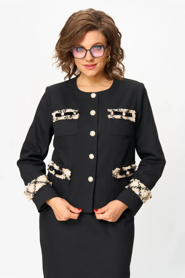 Жакет прямого силуэта с круглой формой горловины, с двухшовными рукавами. Перед с накладными карманами с отделочной тесьмой. Спинка со швом посередине. Изделие на подкладке.