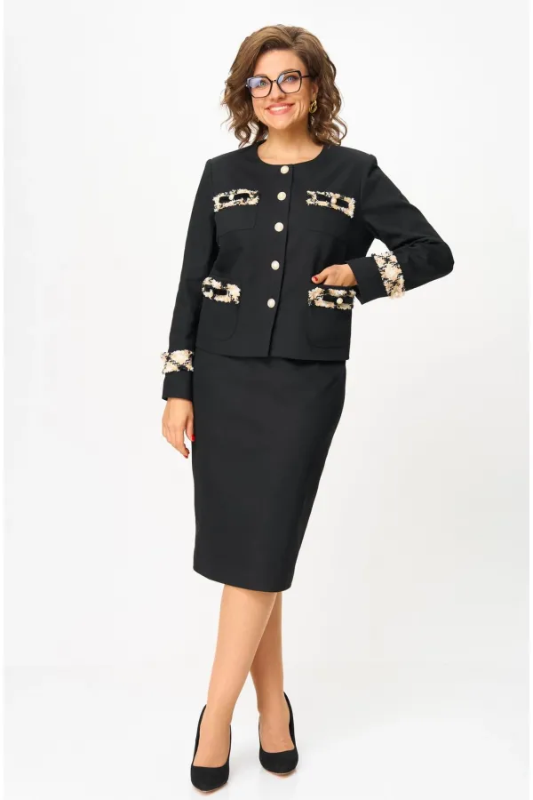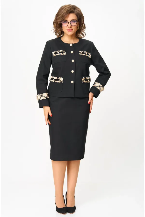 Костюм женский двухпредметный в стиле Шанель, состоит из жакета и юбки.Жакет прямого силуэта с круглой формой горловины, с двухшовными рукавами. Перед с накладными карманами с отделочной тесьмой. Спинка со швом посередин... Читать далее...