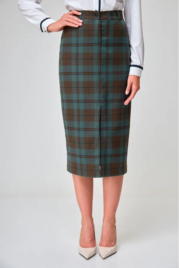 Юбка карандаш, длина миди. По среднему шву переда игривый женственный разрез и застежка на гульфик с молнией. Пояс на петлю пуговицу.